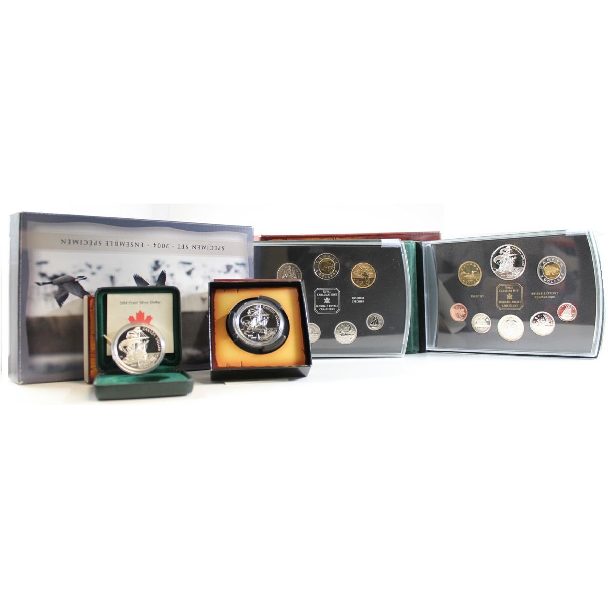 RCM Issue: 2004 Canada RCM Estate Lot. You will receive the following items Issued in 2004; Specimen 7-coin Set, Proof Double Dollar set, Proof Dollar, and BU Dollar. All items come in original mint Issue packaging. Please note coins may have toning. 4pcs.
