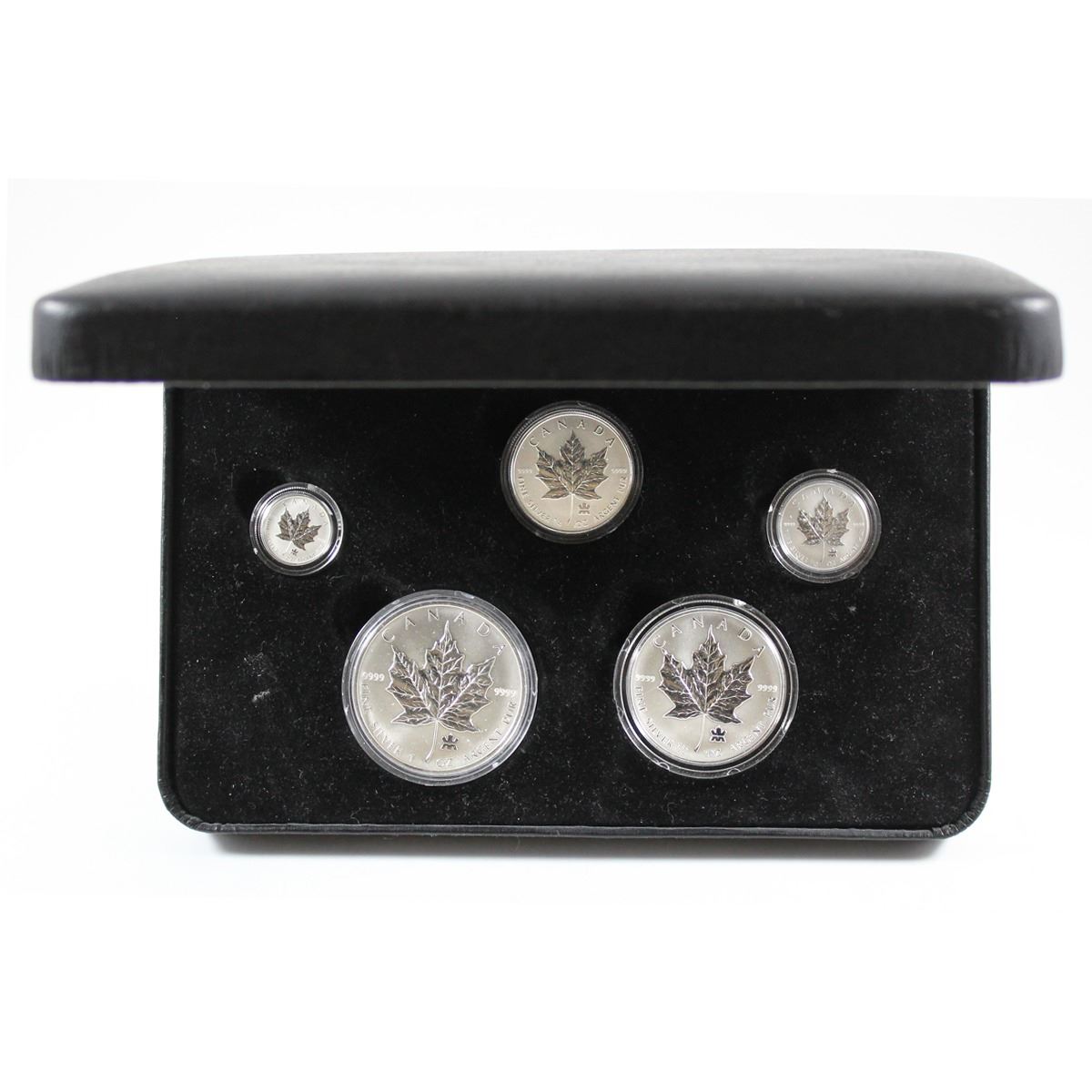 RCM Issue: 2004 Canada RCM Privy Mark Fine Silver Maple Leaf 5-coin Set (missing outer sleeve, case has light residue, 1/2oz Coin has a scratch & 1oz Coin capsule is scratched with toning on obverse). TAX Exempt