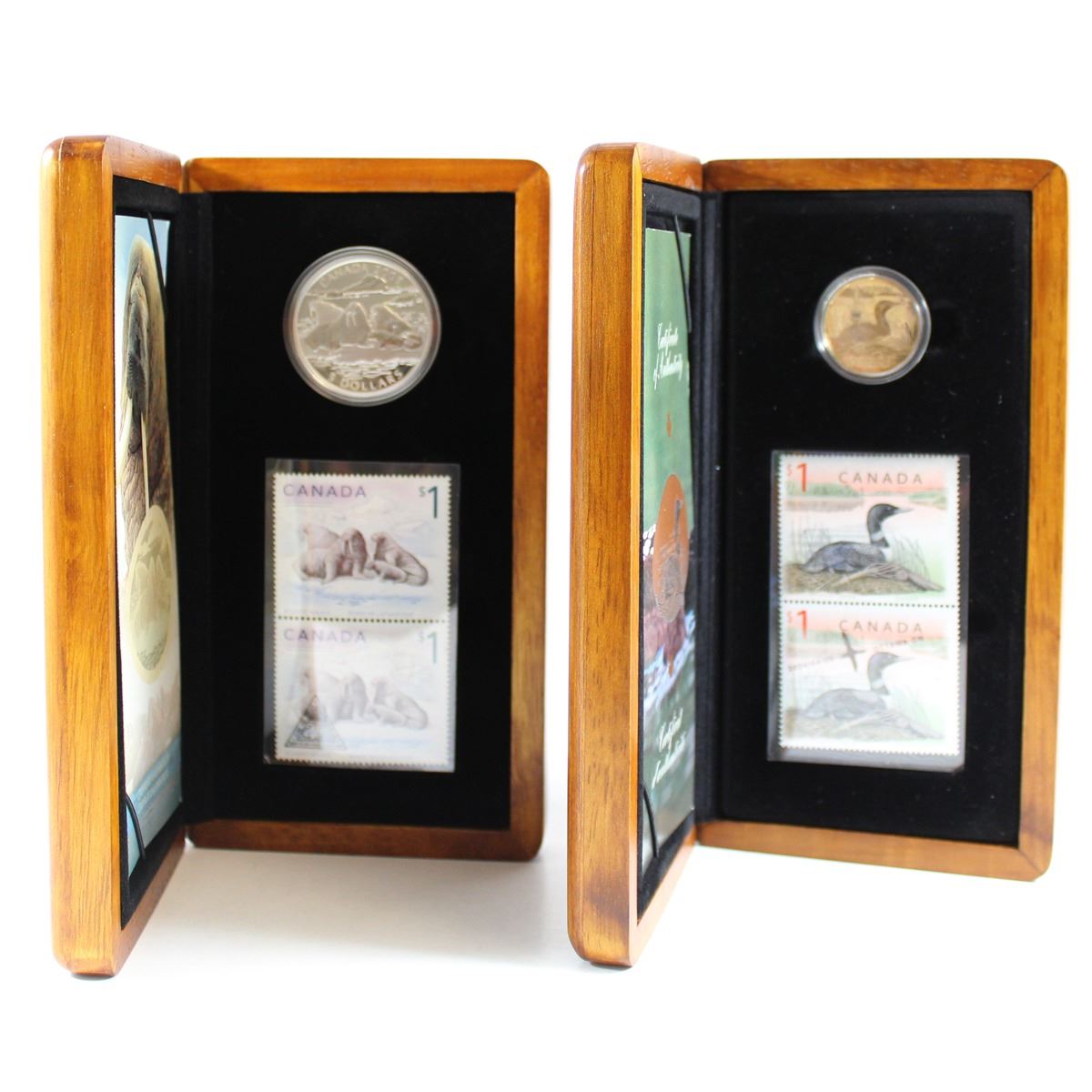 RCM Issue: 2004 Elusive Loon Coins and Stamp Set & 2005 Canada $1 Walrus and Calf Coin and Stamp Sets. Coins come encapsulated with certificate and original wooden clam shell display (wooden display has some stickers). 2 sets