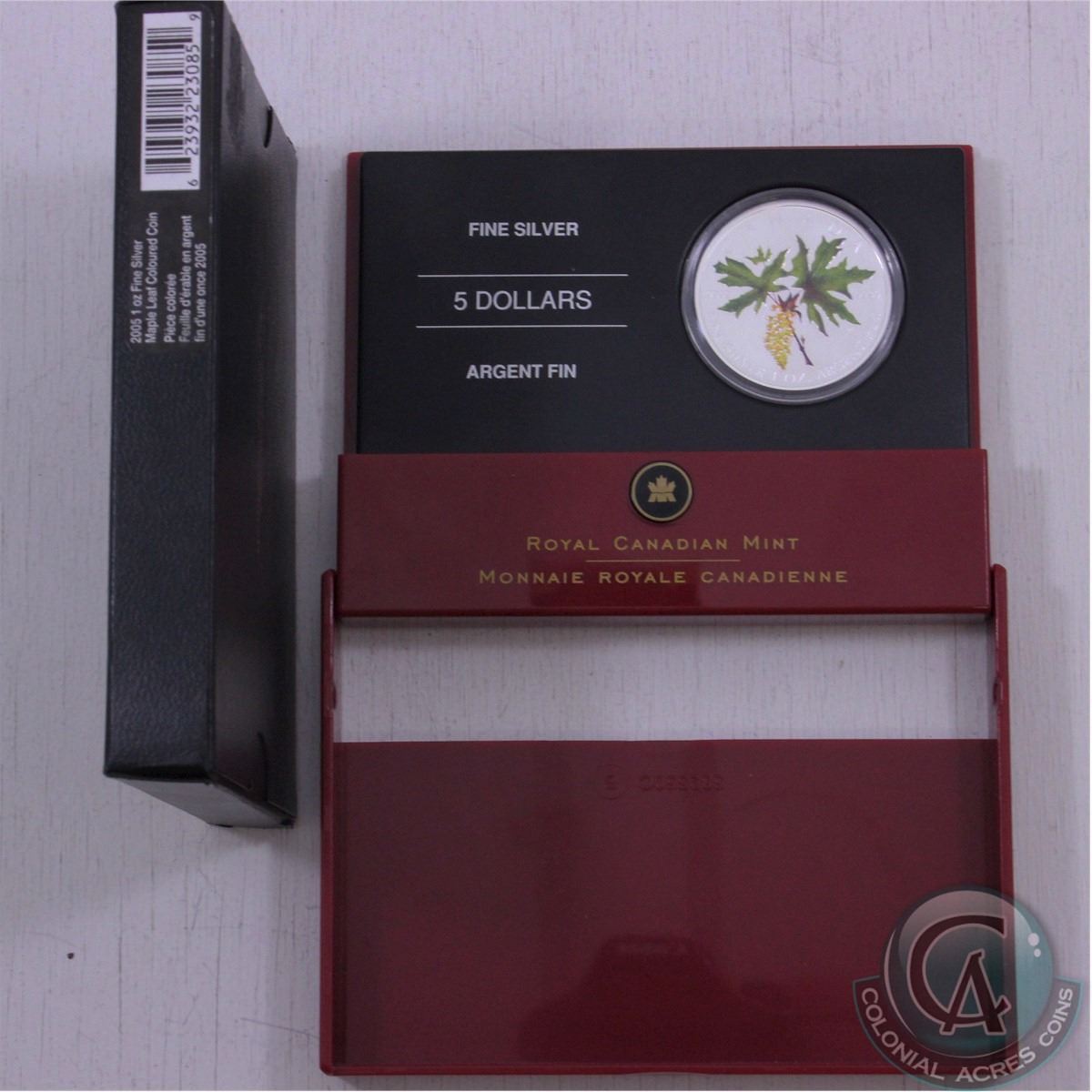 RCM Issue: 2005 Canada $5 1oz Coloured Silver Maple Leaf Coin (TAX Exempt). Coin comes with original mint packaging (lightly toned and the outer sleeve is lightly scuffed).