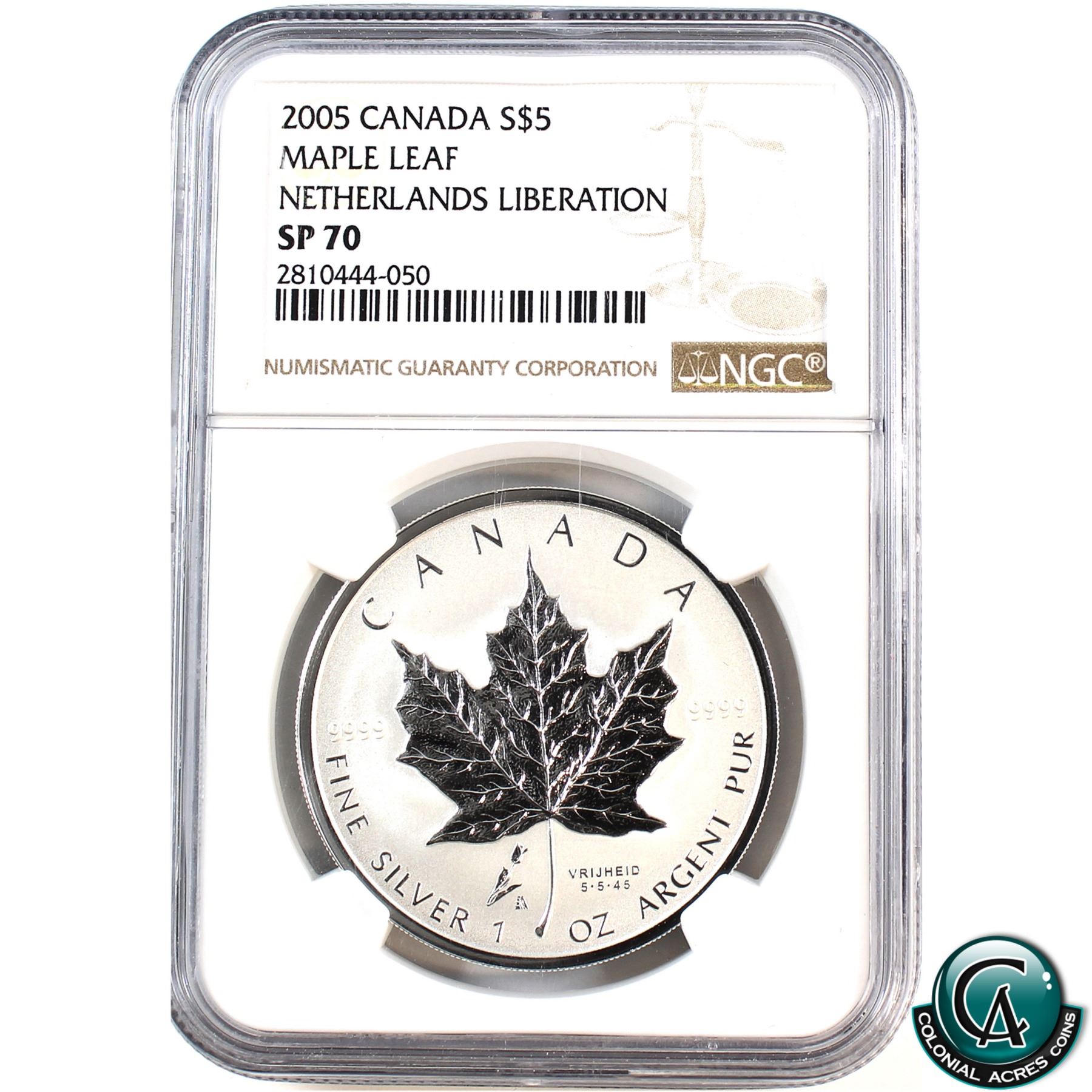 RCM Issue: 2005 Canada $5 Netherlands Liberation Tulip Privy Silver Maple Leaf NGC Certified SP-70. (TAX Exempt)