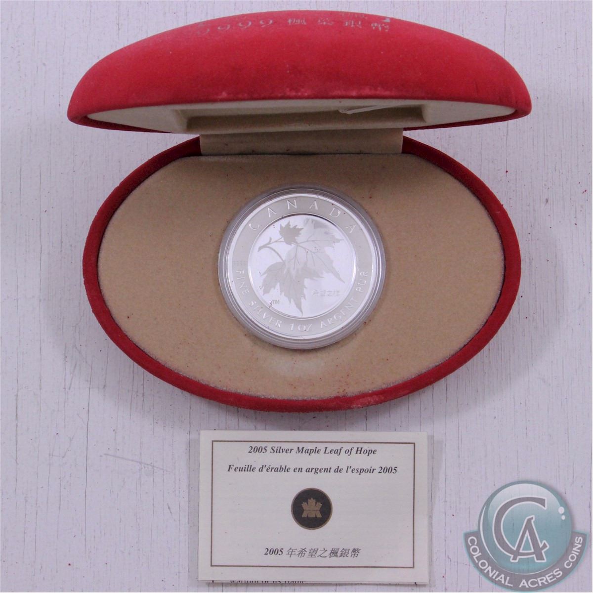 RCM Issue: 2005 Canada $5 Silver Maple of Hope (TAX Exempt). Coin comes encapsulated with display box and Certificate (display box is lightly worn).