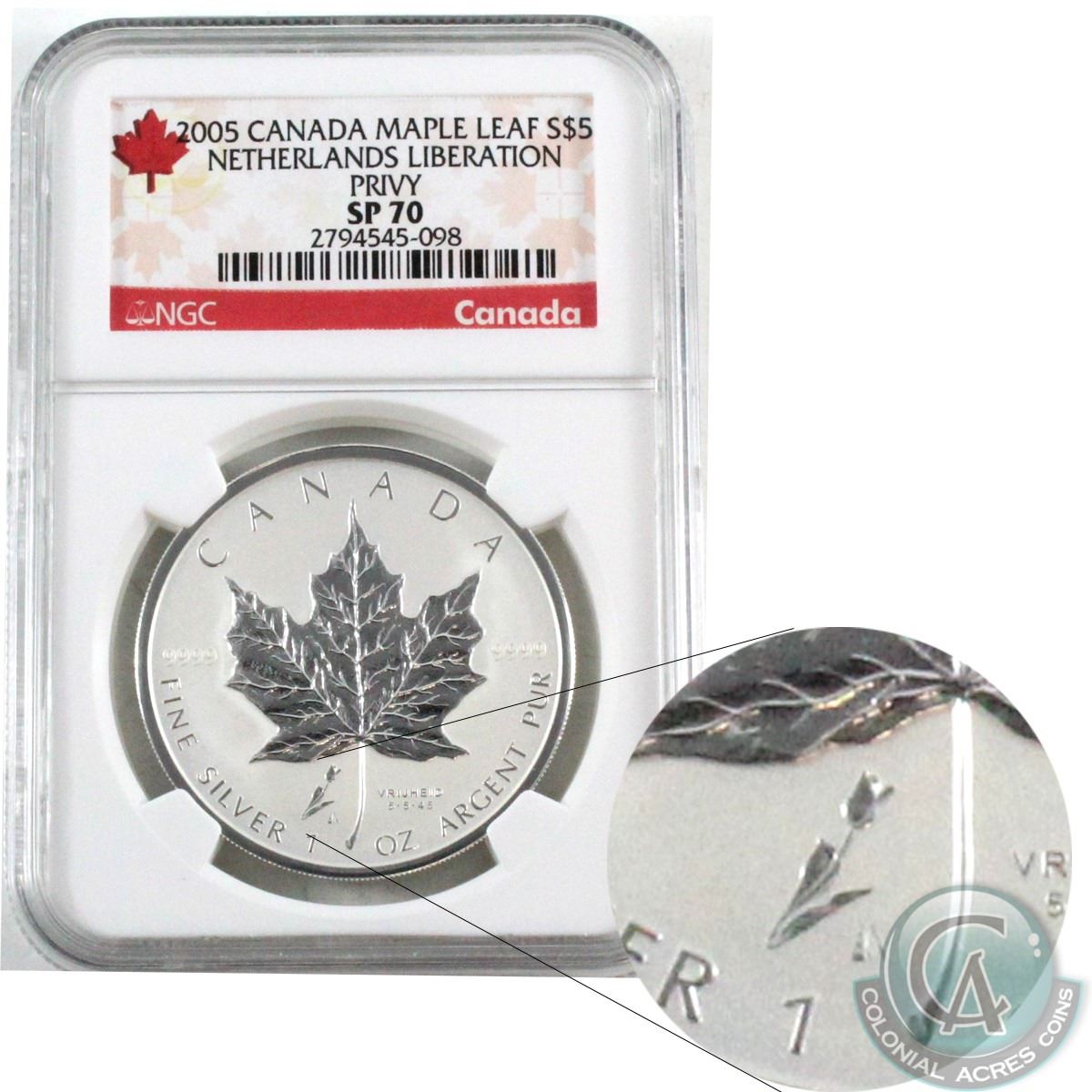 RCM Issue: 2005 Canada $5 VE Day Silver Maple Leaf with Tulip Privy Mark NGC Certified SP 70 (TAX Exempt) POPULATION: 1!!