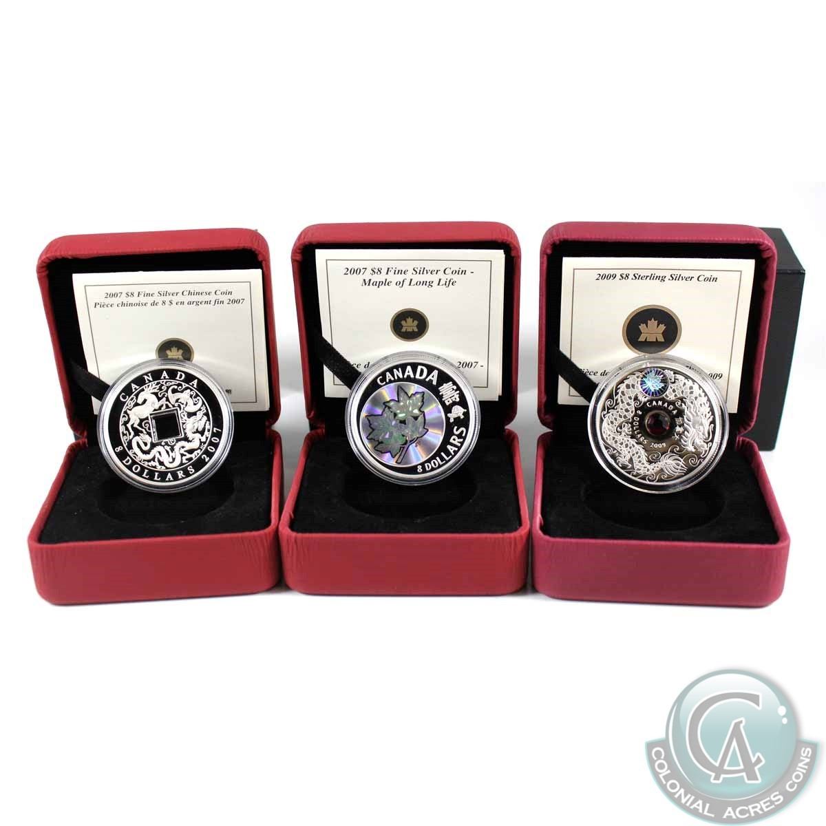 RCM Issue: 2007 Canada $8 Chinese Square Hole Coin, 2007 $8 Maple of Longevity & 2009 $8 Maple of Wisdom Hologram Fine Silver Coins. 3pcs (TAX Exempt)
