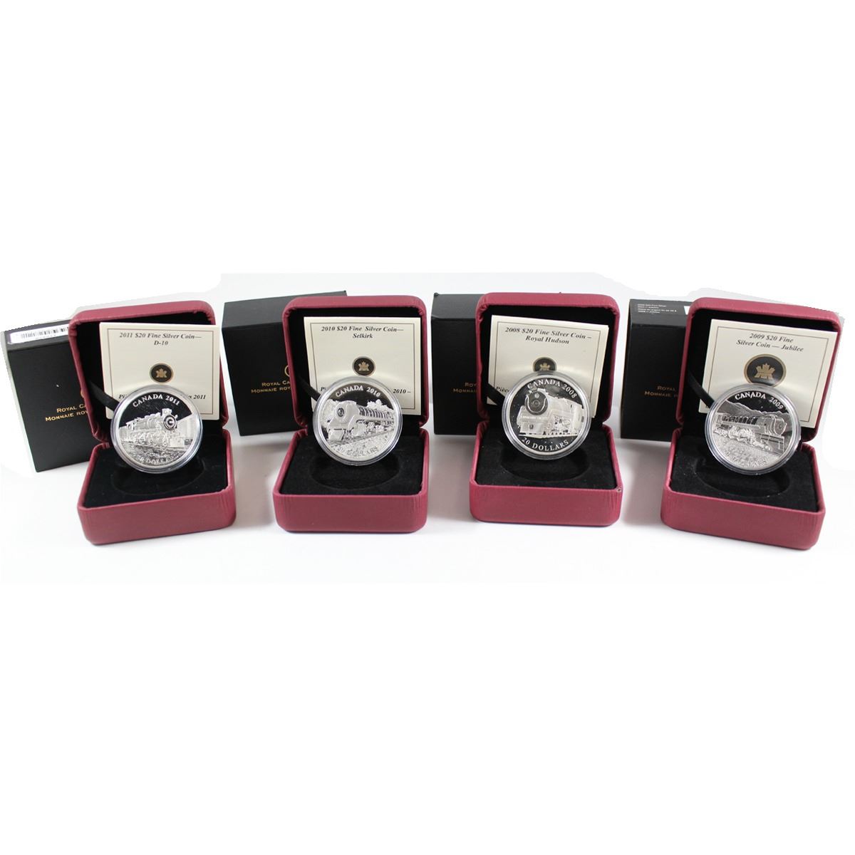 RCM Issue: 2008-2011 Canada $20 Fine Silver Train Collection (TAX Exempt). You will receive the 2008 Royal Hudson, 2009 Jubilee, 2010 Selkirk, and 2011 D-10. Please note coins may have some faint toning and capsules faint scratches. 4pcs.