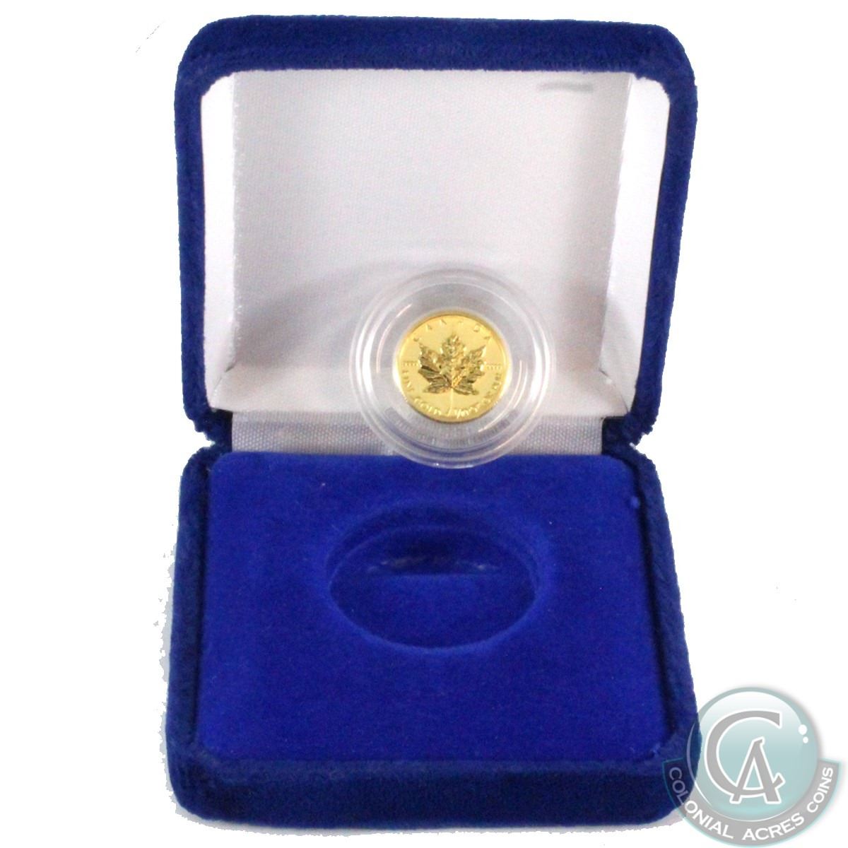 RCM Issue: 2008 Canada $5 1/10th ounce Maple Leaf Fine Gold Coin (TAX Exempt). Coin comes encapsulated in a blue velvet display box.