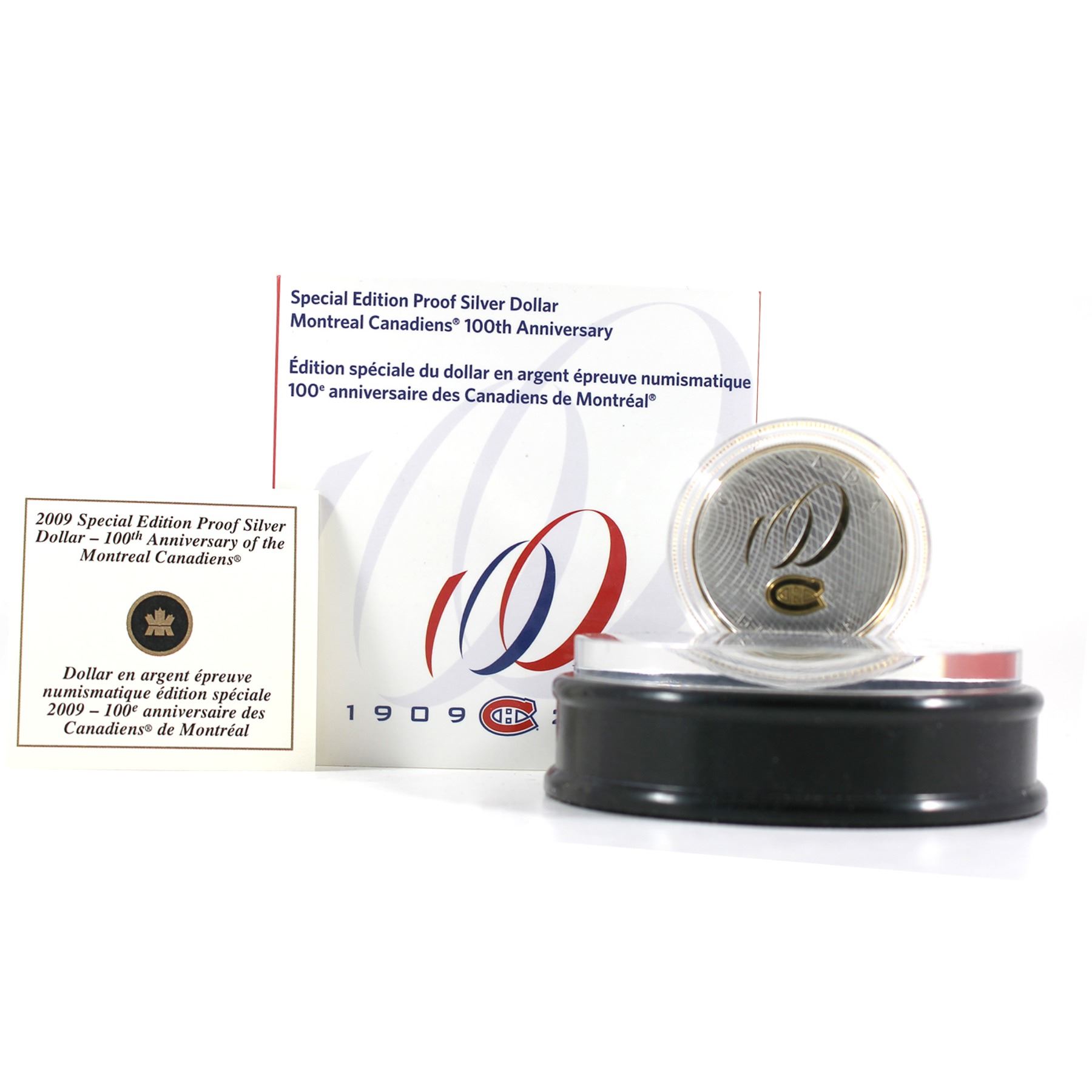 RCM Issue: 2009 Special Edition 100th Anniversary of the Montreal Canadiens Sterling Silver Dollar with Acrylic Stand.