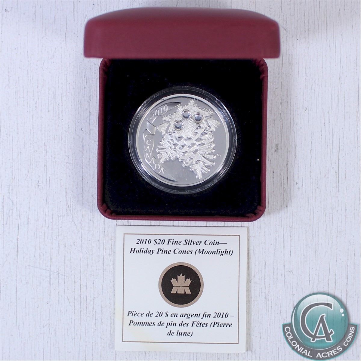 RCM Issue: 2010 Canada $20 Moonlight Crystal Pinecone Fine Silver Coin. Comes with Original Mint Packaging and COA (lightly toned, missing outer cardboard sleeve). TAX Exempt