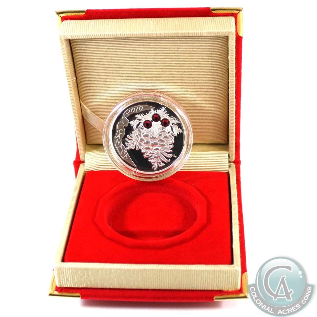 RCM Issue: 2010 Canada $20 Ruby Crystal Pinecone Fine Silver Coin. Comes encapsulated in Red RCM Zodiac Display Box (TAX Exempt)