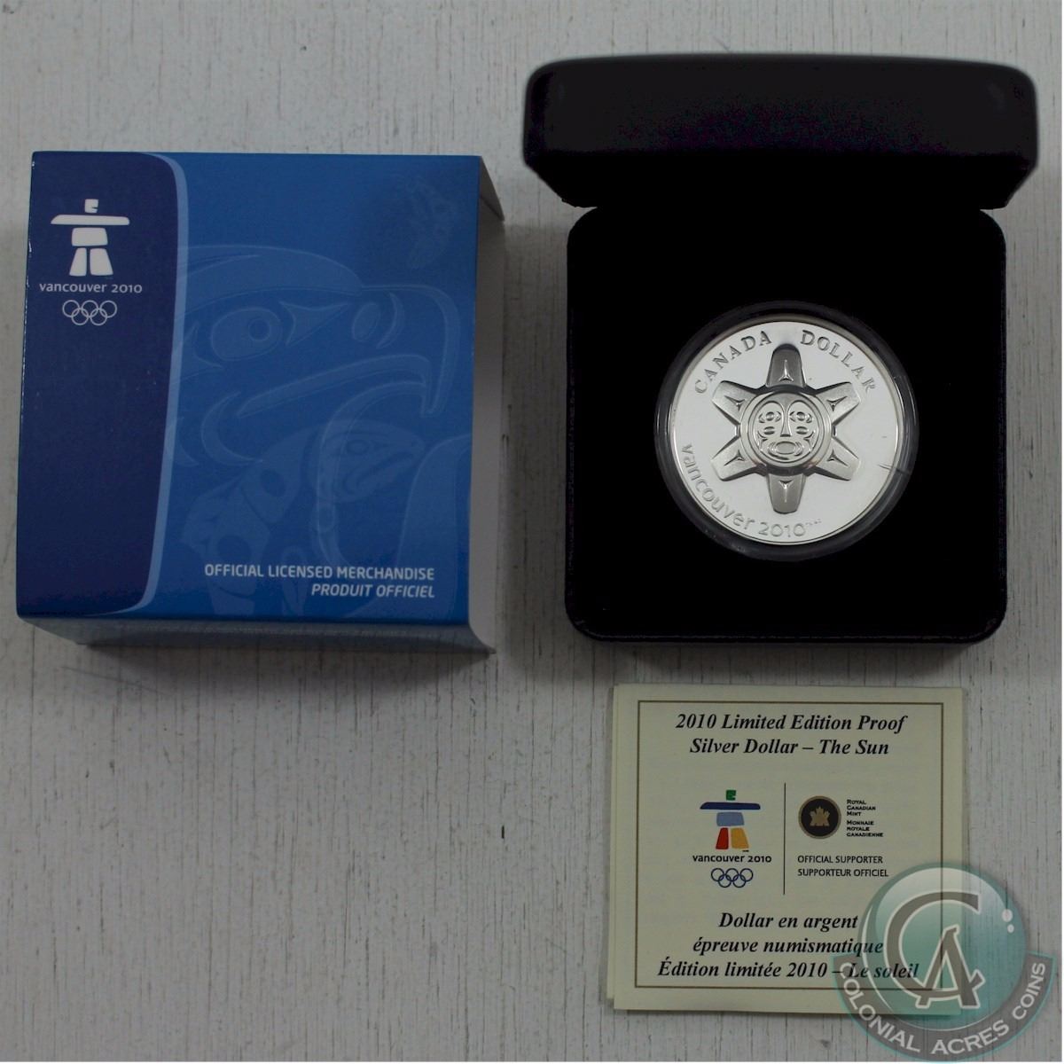 RCM Issue: 2010 The Sun Canada Limited Edition $1 Olympic Commemorative Sterling Silver Proof Dollar. (Capsule has a small crack and is clouded on the obverse)