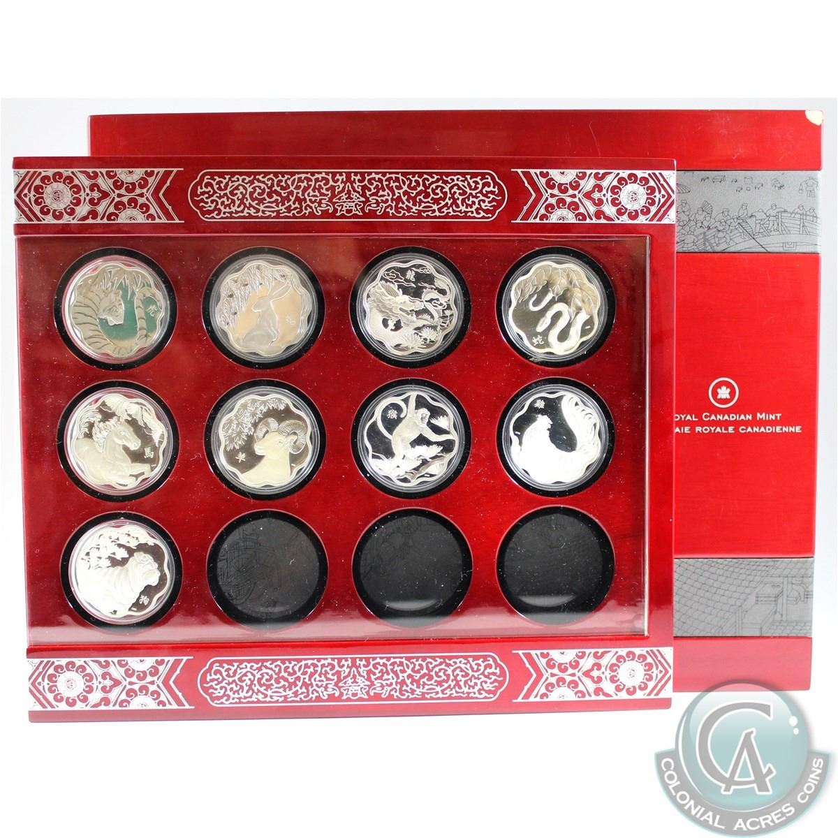 RCM Issue: 2010 to 2021 Canada RCM Issued $15 Fine Silver Lunar LOTUS 12-Year Deluxe Subscription Display Box With 9-coins (TAX Exempt). You will receive the 2010 Tiger, 2011 Rabbit, 2012 Dragon, 2013 Snake, 2014 Horse, 2015 Ram, 2016 Monkey, 2017 Rooster, and 2018 Dog. Please note the deluxe box has a chip on one corner and contains scratches. 9pcs + Box