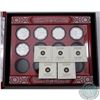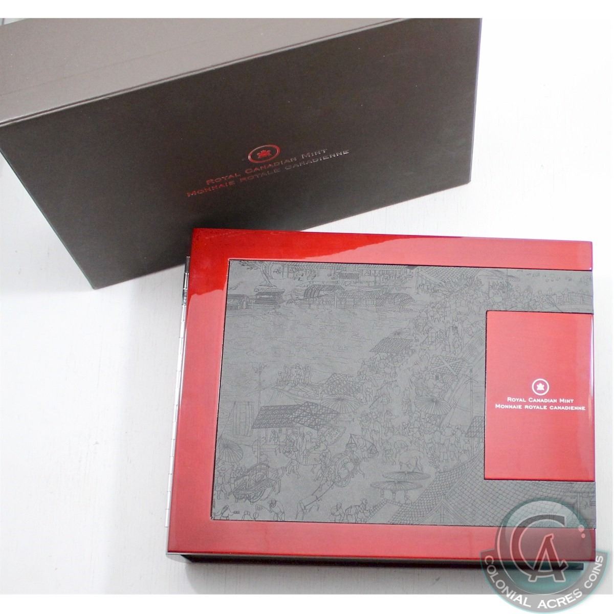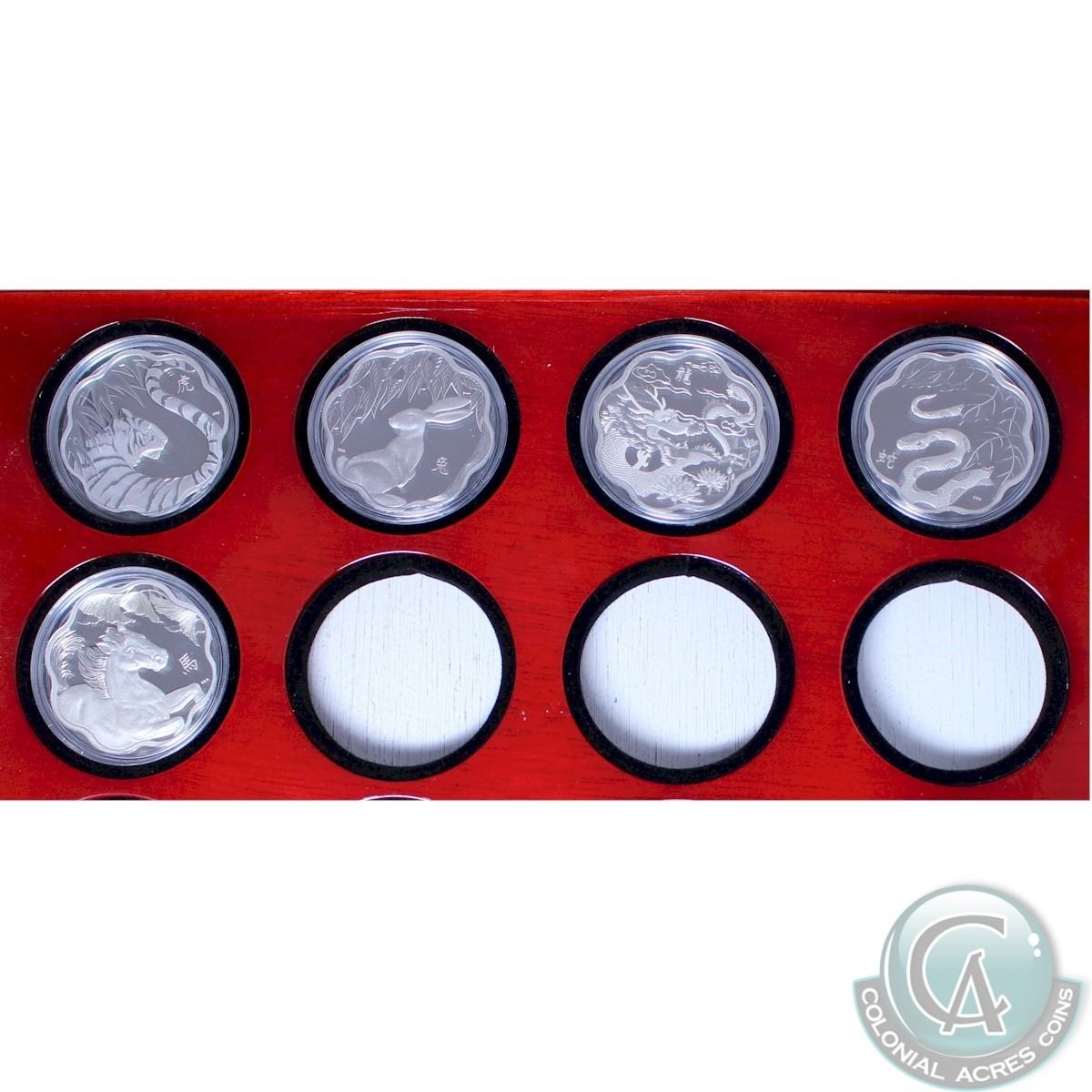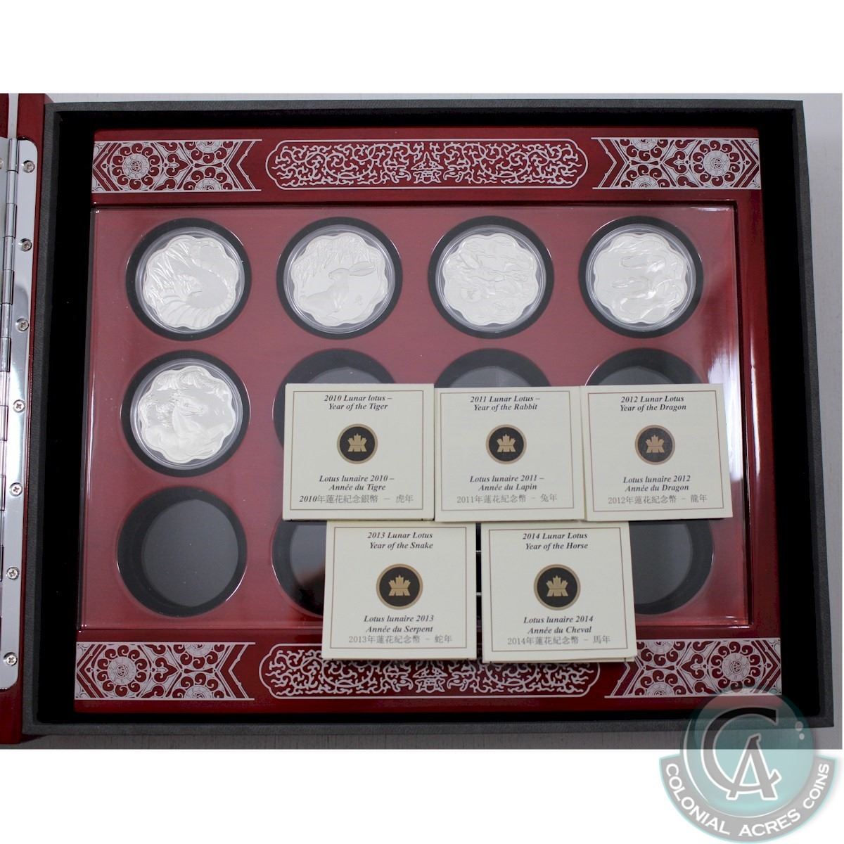 This set includes the: 2010 $15 Lunar Lotus Tiger, 2011 $15 Lunar Lotus Rabbit, 2012 $15 Lunar Lotus Dragon, 2013 $15 Lunar Lotus Snake, and 2014 $15 Lunar Lotus Horse. Each Coin comes with Certificate and the Deluxe Mint Display Box (Outer cardboard shipper is tattered).