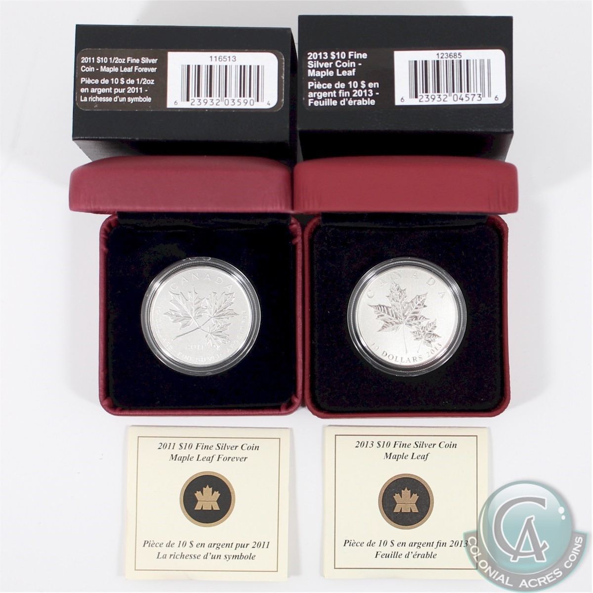 RCM Issue: 2011 Canada $10 Maple Leaf Forever & 2013 $10 Maple Leaf Fine Silver Coins. 2pcs (TAX Exempt)