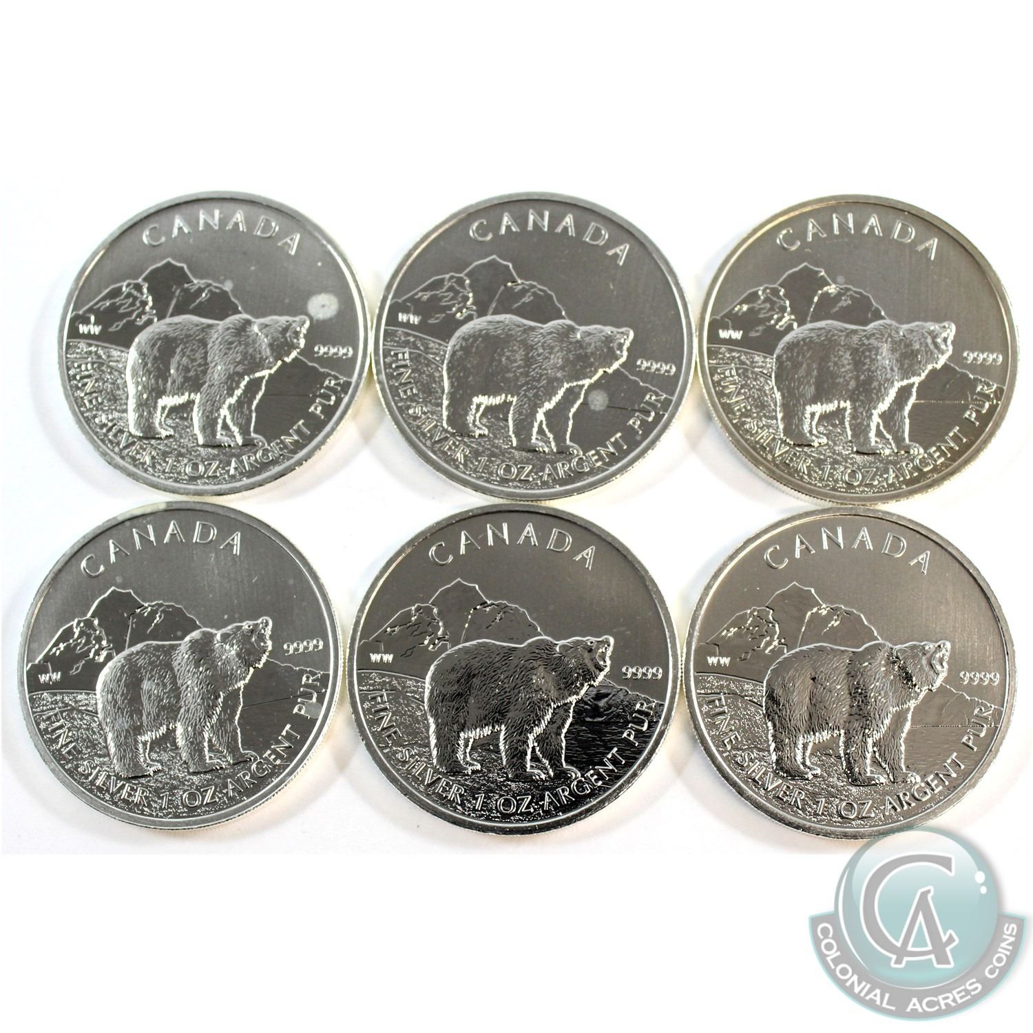 RCM Issue: 2011 Canada $5 Wildlife Grizzly 1oz .9999 Fine Silver Maple Leafs (coins have toning spots). 6pcs (TAX Exempt)