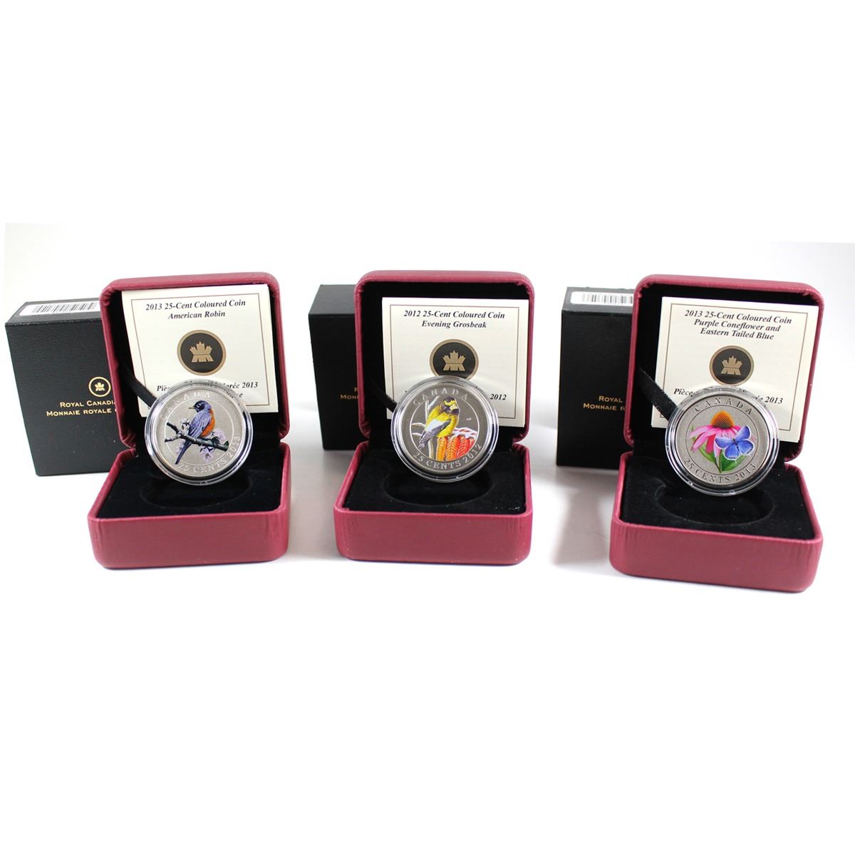 RCM Issue: 2012-2013 Canada Coloured 25-cent Collection: You will receive the 2012 Evening Grosbeak, 2013 American Robin, and 2013 Purple Coneflower and Eastern Tailed Blue Butterfly. 3pcs.
