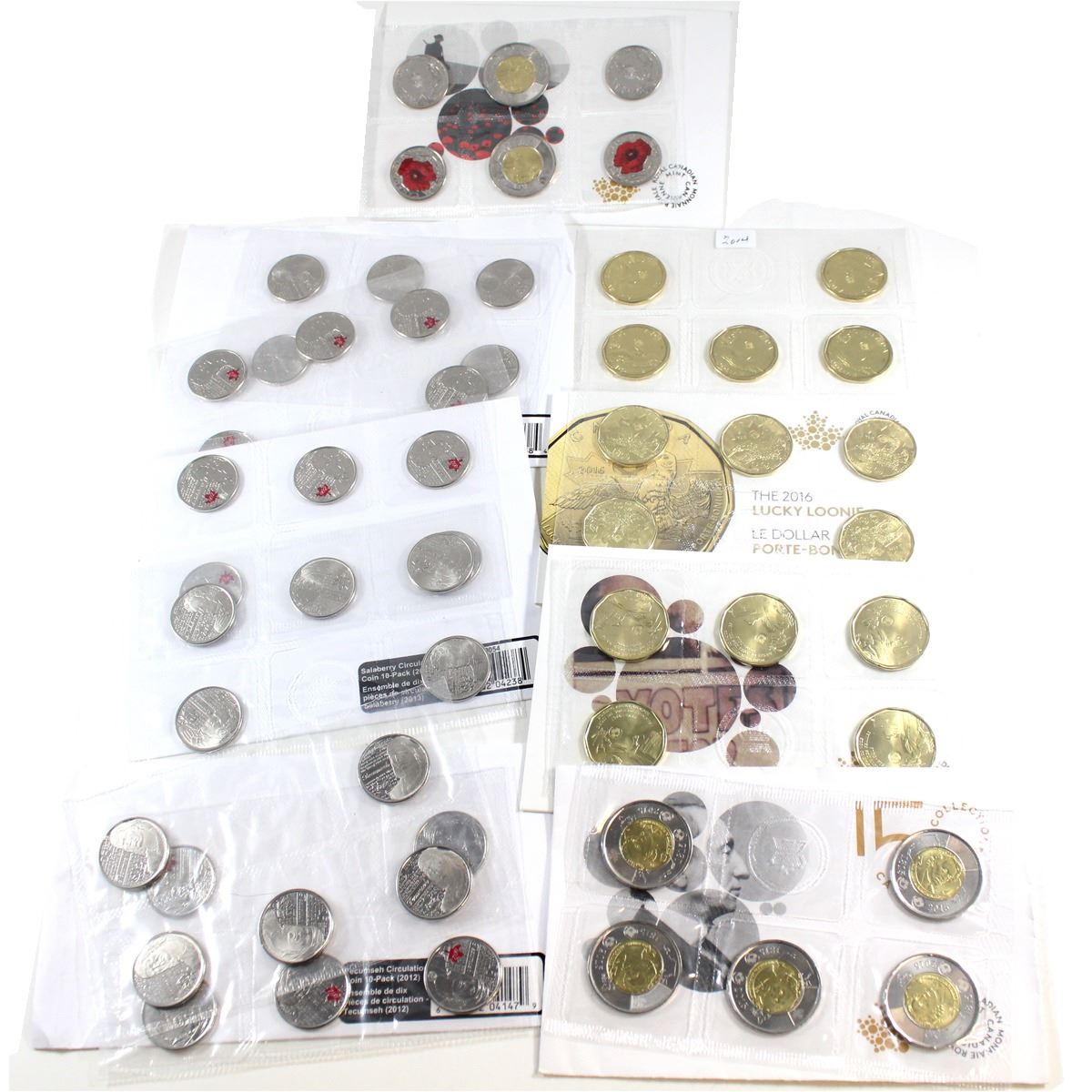 RCM Issue: 2012-2017 RCM Issue Commemorative Circulation 5 & 10 Packs of Coins. The lot includes: 2012 25c Tecumseh 10-pack, 2x 2013 25c Salaberry 10-packs, 2014 Lucky Loon 5-pack, 2015 Sir John A MacDonald $2 5-pack, 2015 100th Anniversary of Flanders Field 6-pack, 2016 Lucky Loon 5-pack and the 2016 Women's Right to Vote 5-pack. Please note the outer envelopes are scuffed and lightly worn. 8pcs