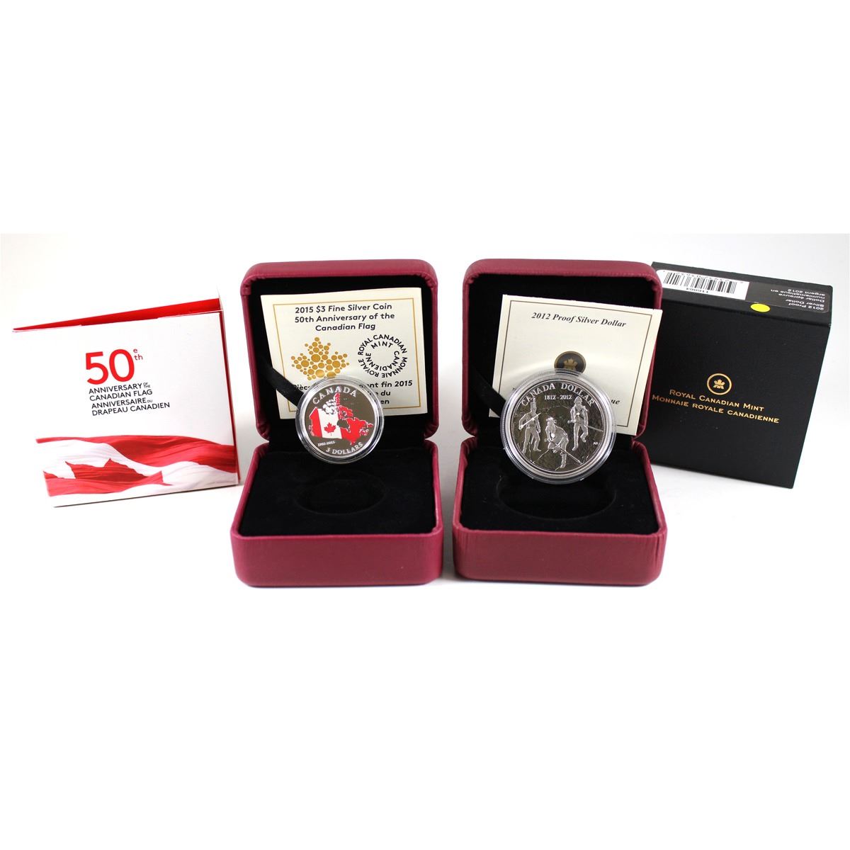 RCM Issue: 2012 Canada Proof Silver Dollar, and 2015 Canada $3 50th Anniversary of the Canadian Flag Fine Silver Coins (Tax Exempt) 2pcs.