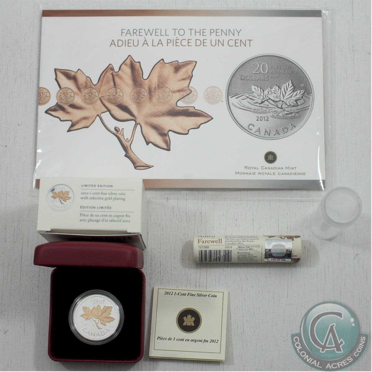 RCM Issue: 2012 Farewell to the Penny Combo. This lot includes the following: 2012 Special Wrapped Roll, 2012 1-cent Farewell to the Penny Coin with Selective Gold Plating, & 2012 Canada $20 "Farewell to the Penny". 3pcs