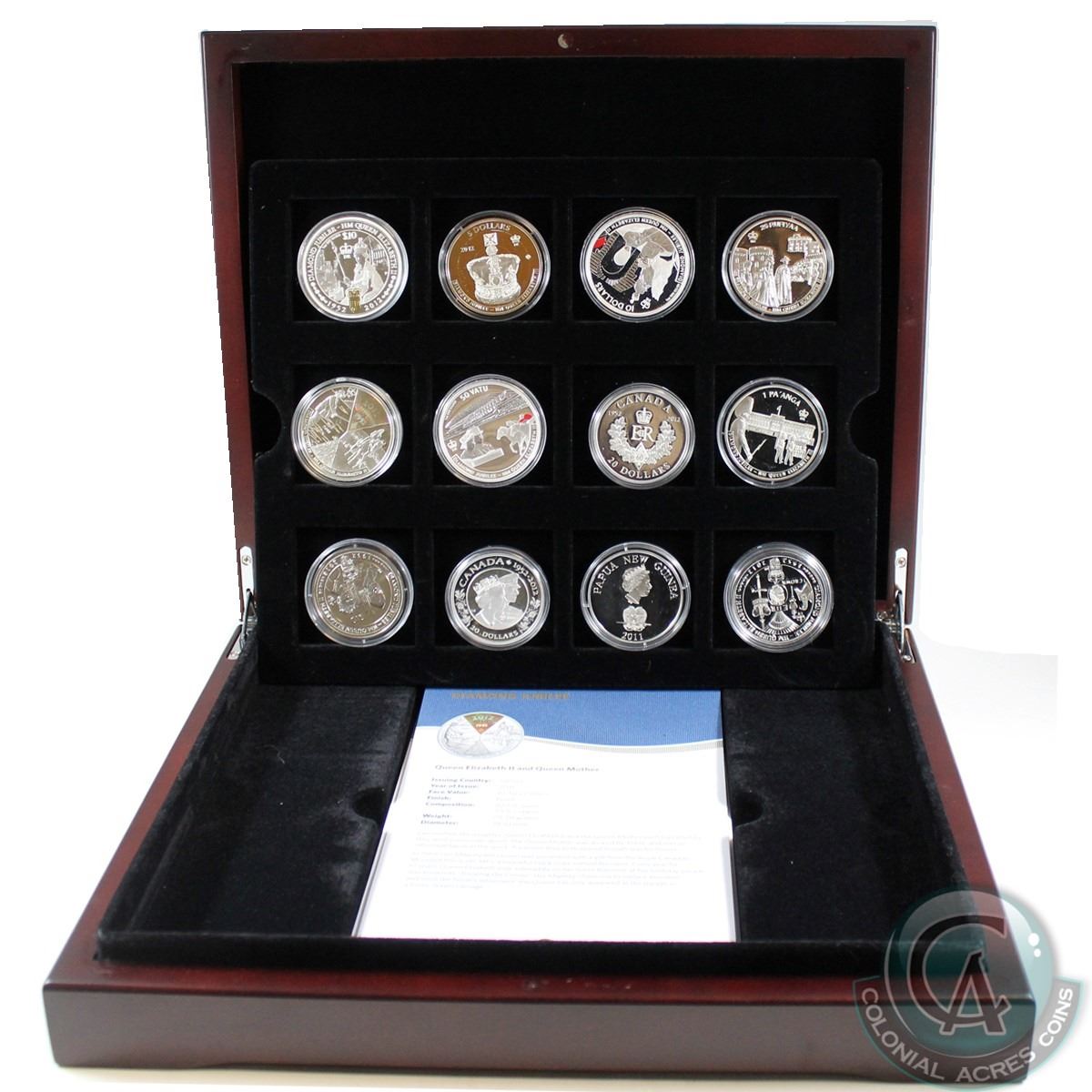 RCM Issue; 2012 Official Diamond Jubilee Silver 12-Coin Collection in Deluxe Presentation Case issued by the Royal Canadian Mint. You will receive the following: Solomon Island - Coronation, Canada - Elizabeth & Phillip, Isle of Man - Head of State, Canada - Royal Cypher, Virgin Islands - Defender of Faith, Maldives - Windsor Castle, New Guinea - Sword of State, Tonga - Buckingham Palace, Fiji - State Crown, Vanuatu - Ascot Race, Cook Islands - Trooping the Colour, and Samoa - Elizabeth and Queen Mother. Coins are either Sterling Silver or.999 Fine Silver. Each coin is encapsulated and accompanied by a COA. Please note capsules may have light scratches.