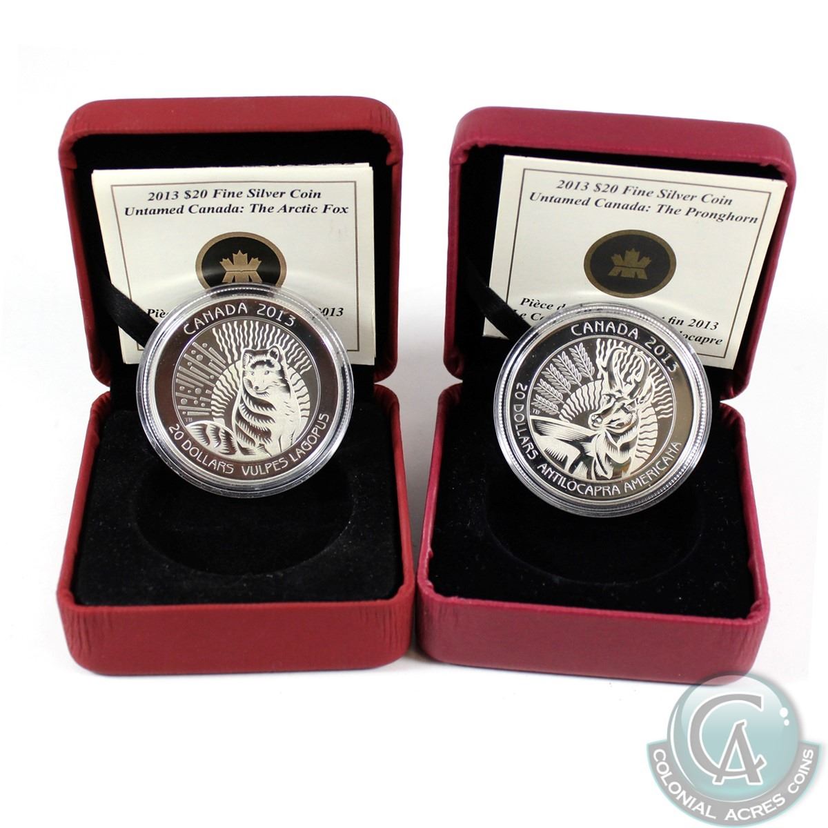 RCM Issue; 2013 $20 Untamed Canada - The Arctic Fox & The Pronghorn Fine Silver Coins (Tax Exempt). Outer sleeves not included. 2pcs.
