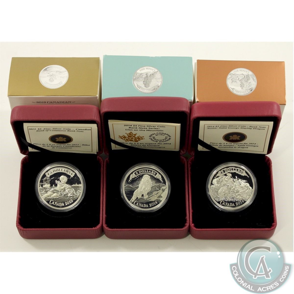 RCM Issue; 2013-2014 $5 Bank Note Design Fine Silver Coin collection (Tax Exempt). You will receive the 2013 Bank of Commerce Design, 2014 Lion on the Mountain. & 2014 Saint George Slaying the Dragon. 3pcs.