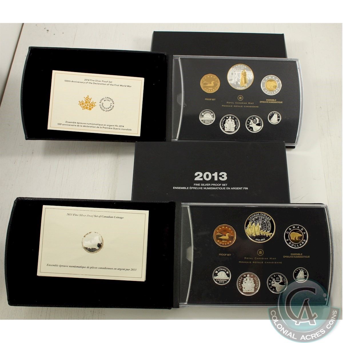 RCM Issue; 2013 & 2014 Fine Silver Proof Sets (Tax Exempt). Please note 2013 COA is stuck to inner plastic cover. 2pcs.