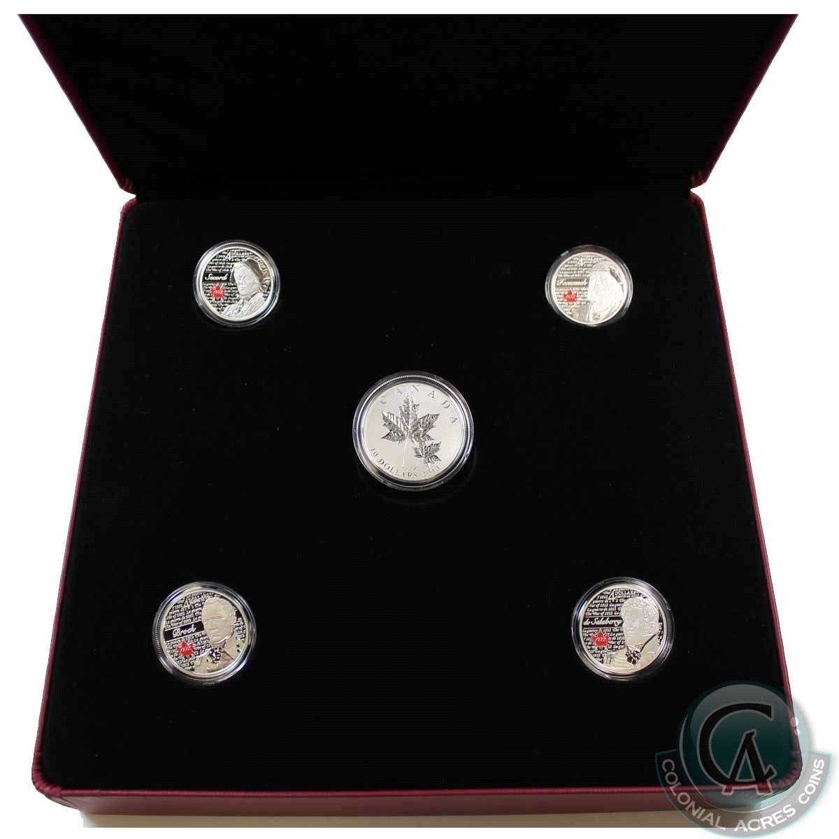 RCM Issue: 2013 Canadian Icon 5-coin Fine Silver Proof Set. Limited Mintage of 800. This set includes the four coins issued from 2012-2013 Heroes of the War of 1812 $4 Fine Silver Coin (Salaberry, Secord, Brock & Tecumseh) & the 2013 $10 Fine Silver Maple Leaf Coin.