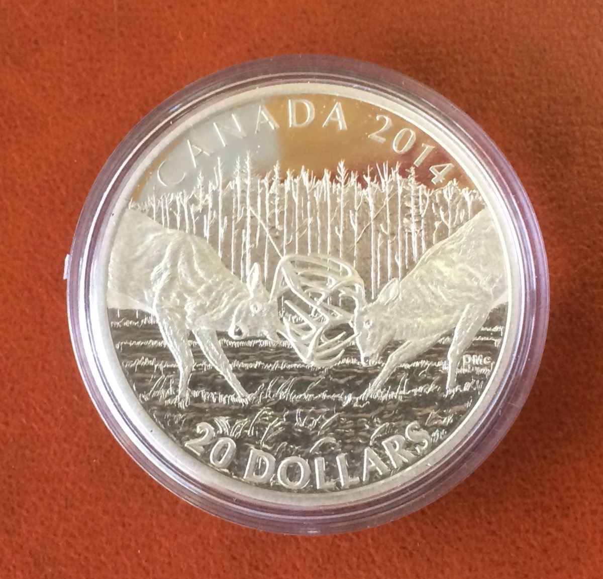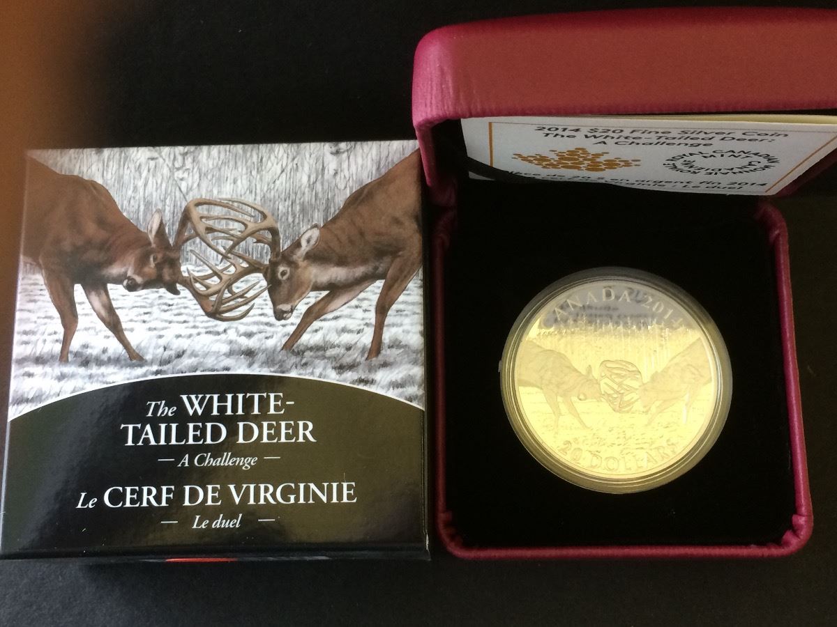 RCM Issue: 2014 20$ Fine Silver The White-Tailed Deer:A Challenge, No Tax C.O.A & Box