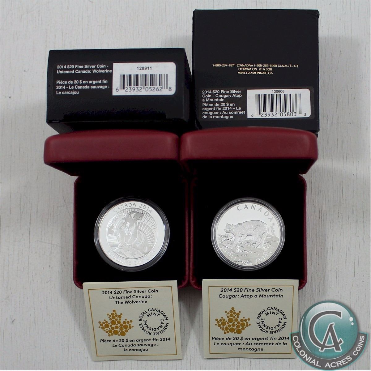 RCM Issue: 2014 $20 Untamed Canada Series - Wolverine (Coin has a small scratch) & 2014 $20 Cougar: Atop A Mountain Fine Silver Coins (TAX Exempt). 2pcs