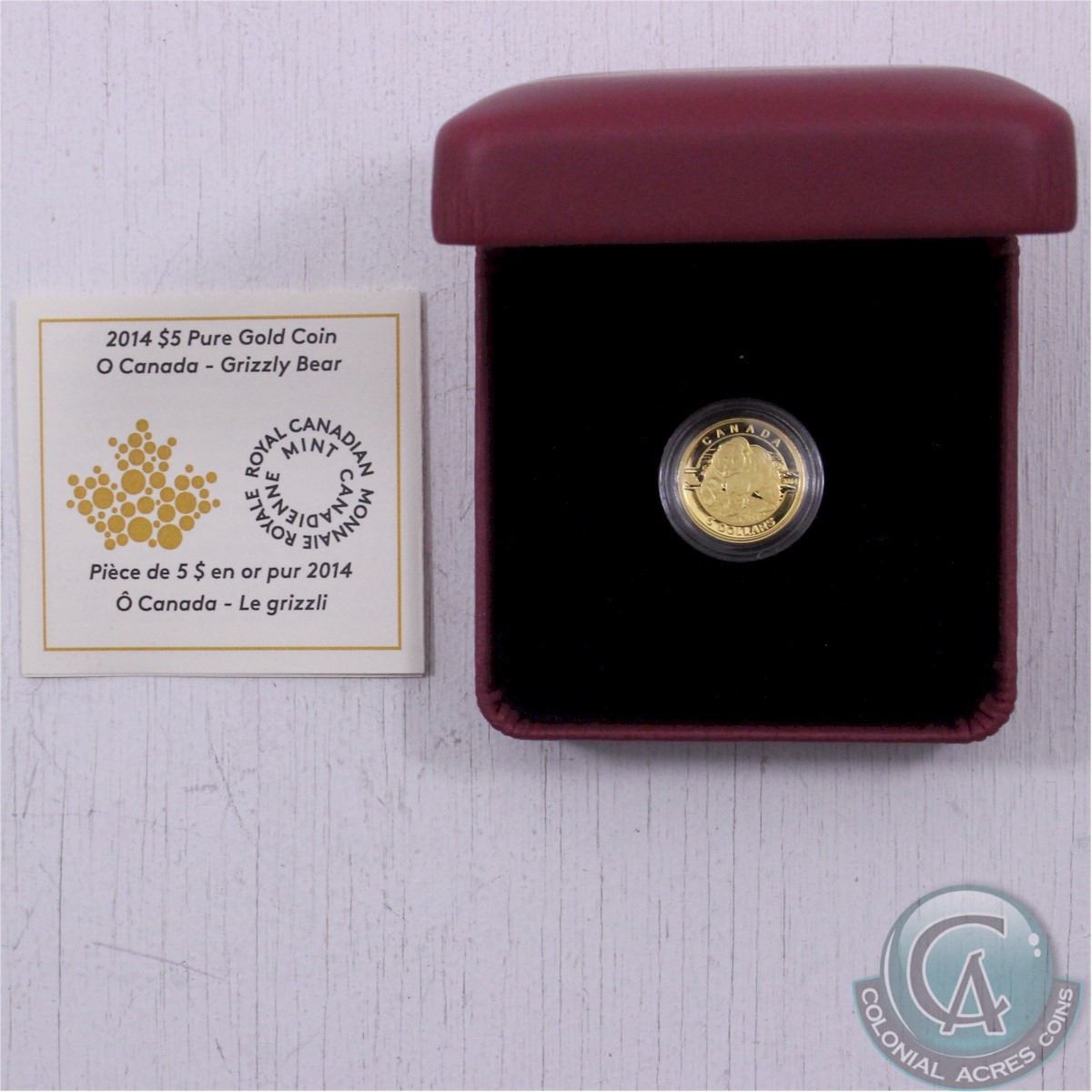 RCM Issue: 2014 $5 O Canada Series Pure Gold Coin - Grizzly Bear (TAX Exempt). Coin comes encapsulated with Certificate and display box.