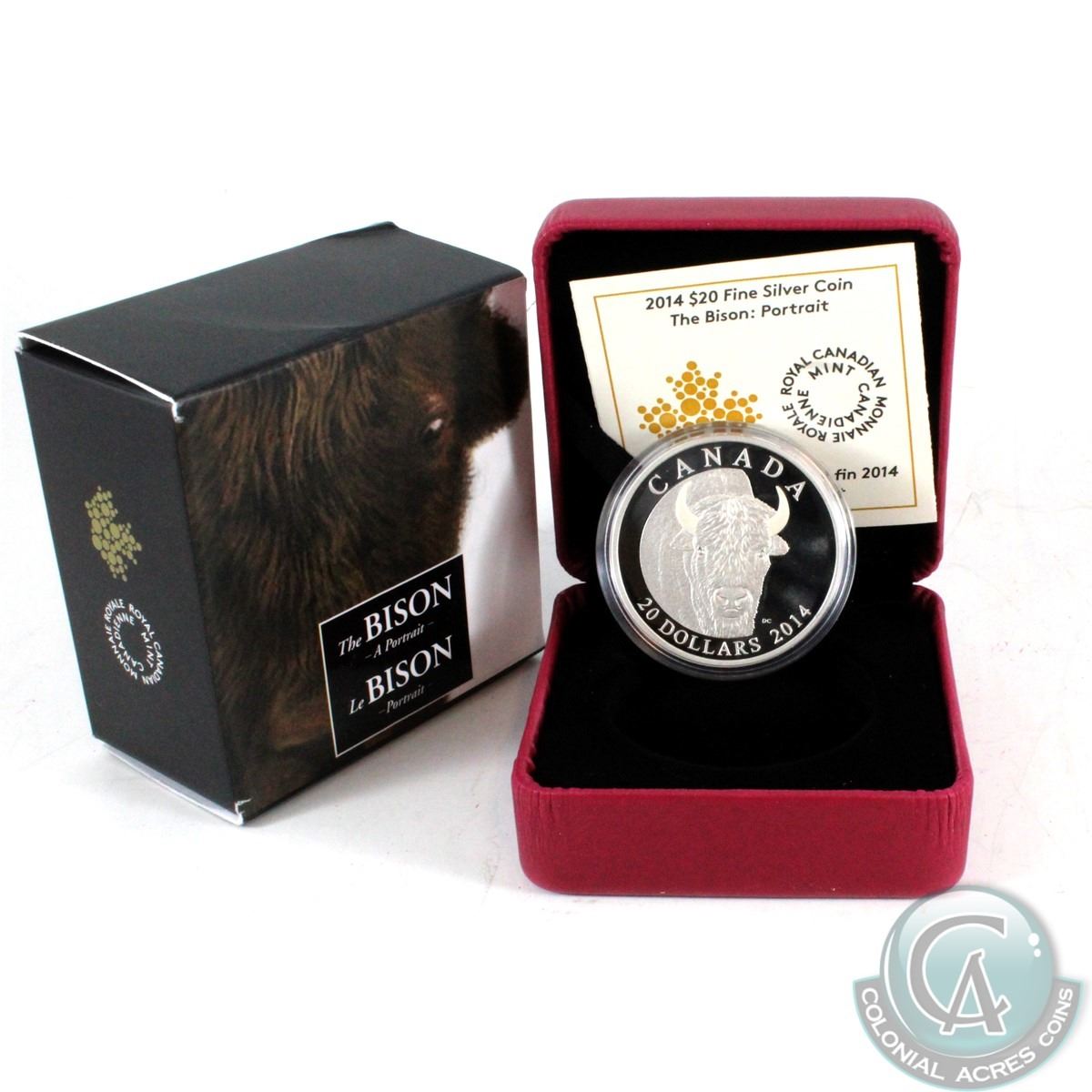 RCM Issue: 2014 Canada $20 1oz The Bison: A Portrait .9999 Fine Silver Coin (TAX Exempt). Please Note that the outer box is slightly bent. This coin is the First coin in the Bison Series.