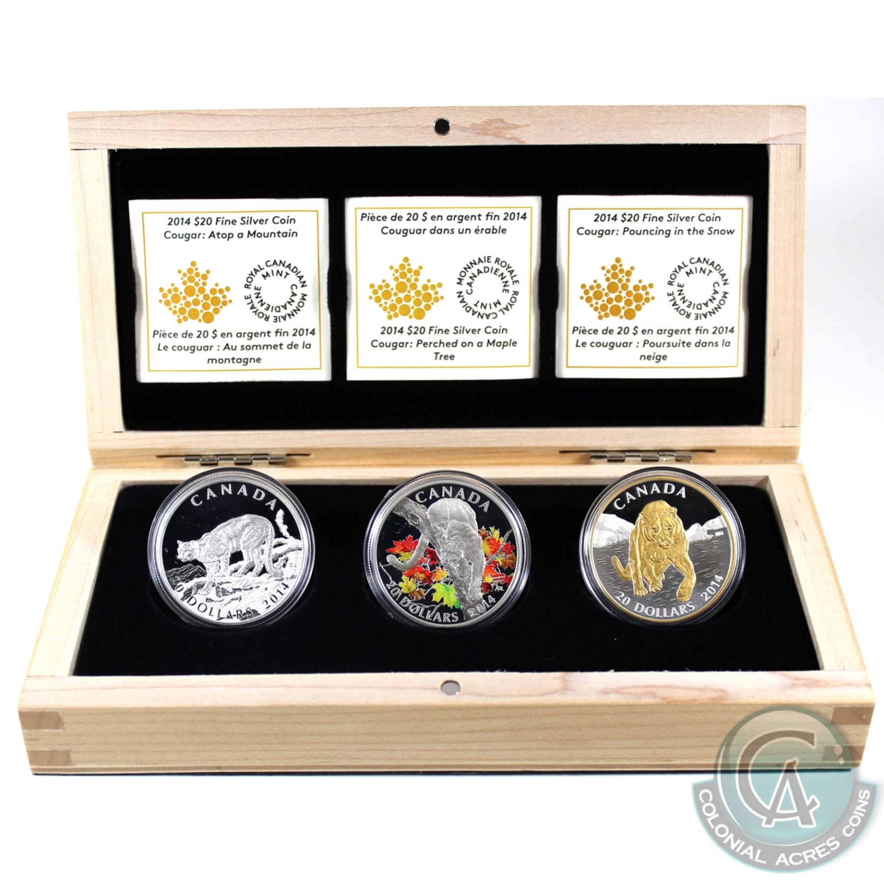 RCM Issue: 2014 Canada $20 Cougar Fine Silver 3-coin Series in Deluxe Case. You will receive Perched on a Maple Tree, Atop a Mountain & Pouncing in the Snow (Perched on a Maple Tree coin capsule is lightly scratched). 3pcs (TAX Exempt)