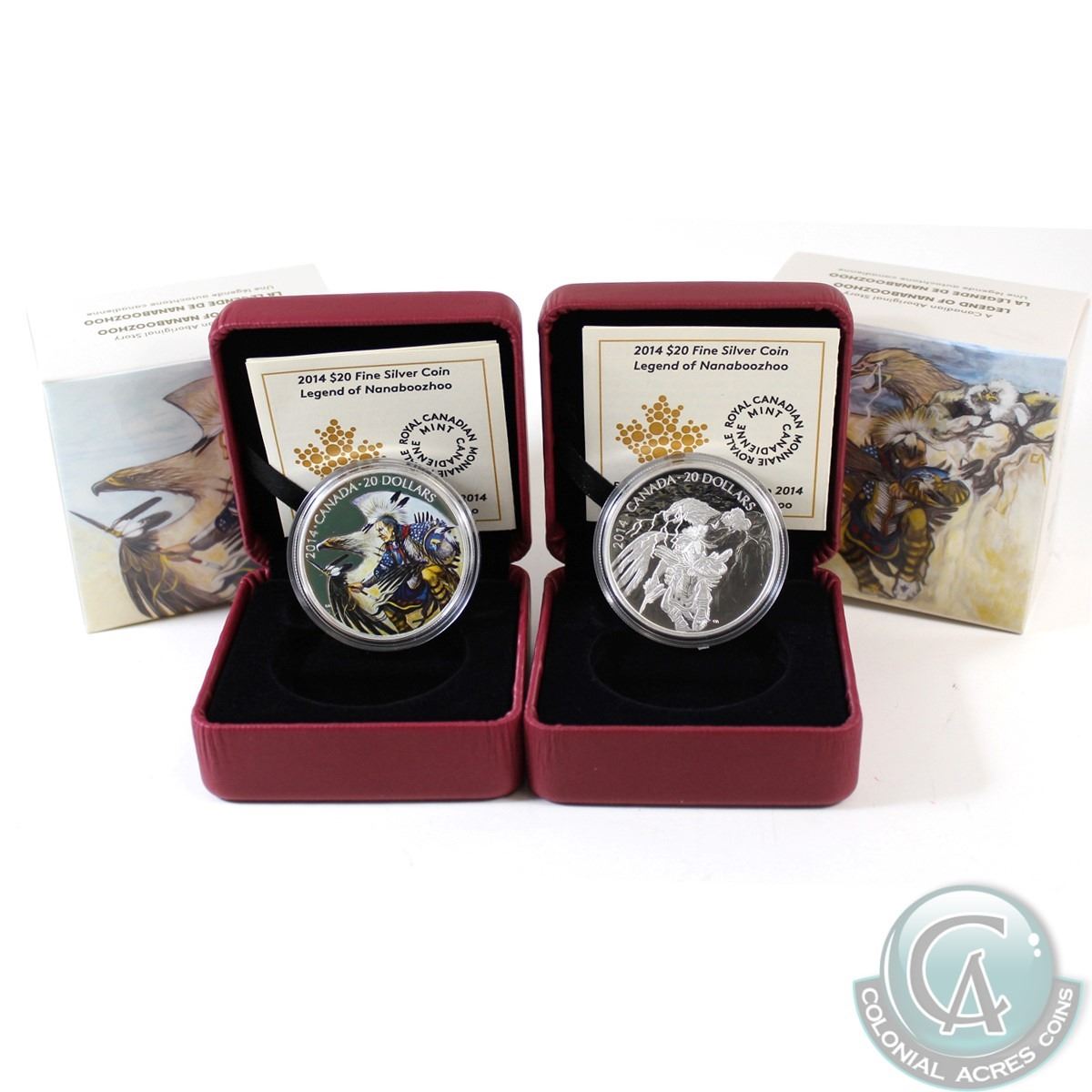 RCM Issue: 2014 Canada $20 Nanaboozhoo and the Thunderbird's Nest & 2014 Coloured The Legend of Nanaboozhoo Fine Silver Coins. 2pcs (TAX Exempt)