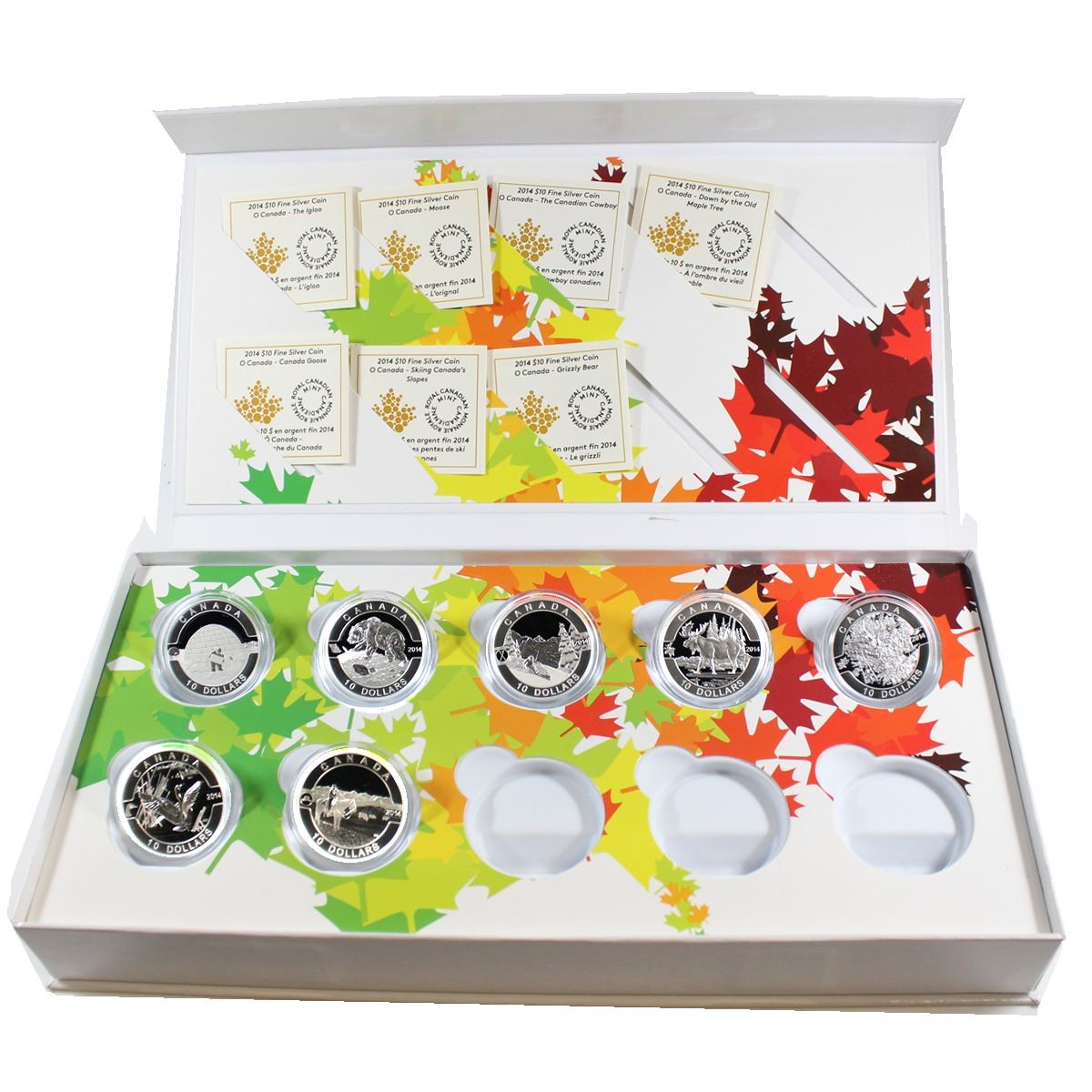 RCM Issue: 2014 O Canada $10 Fine Silver Set with Deluxe Box. This Set includes 7 out of 10 of the Coins - the Igloo, Moose, Canadian Cowboy, Down by the Old Maple Tree, Canada Goose, Skiing Canada's Slopes & Grizzly Bear. 7pcs & case (TAX Exempt)