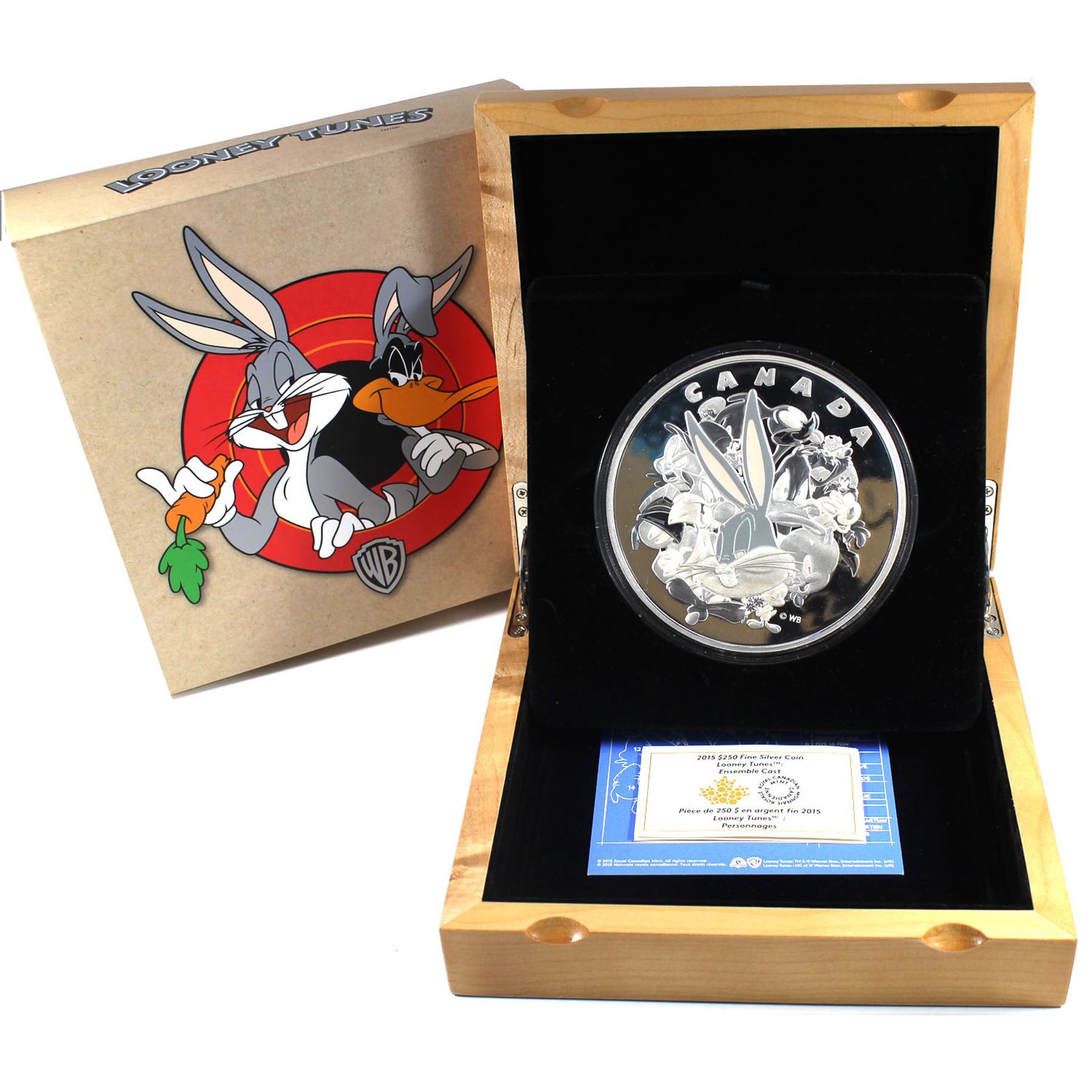 RCM Issue: 2015 $250 Looney Tunes Ensemble Cast Fine Silver Kilo Coin (TAX Exempt). Please note capsule contains faint scratches and outer beauty box shows some signs of wear.