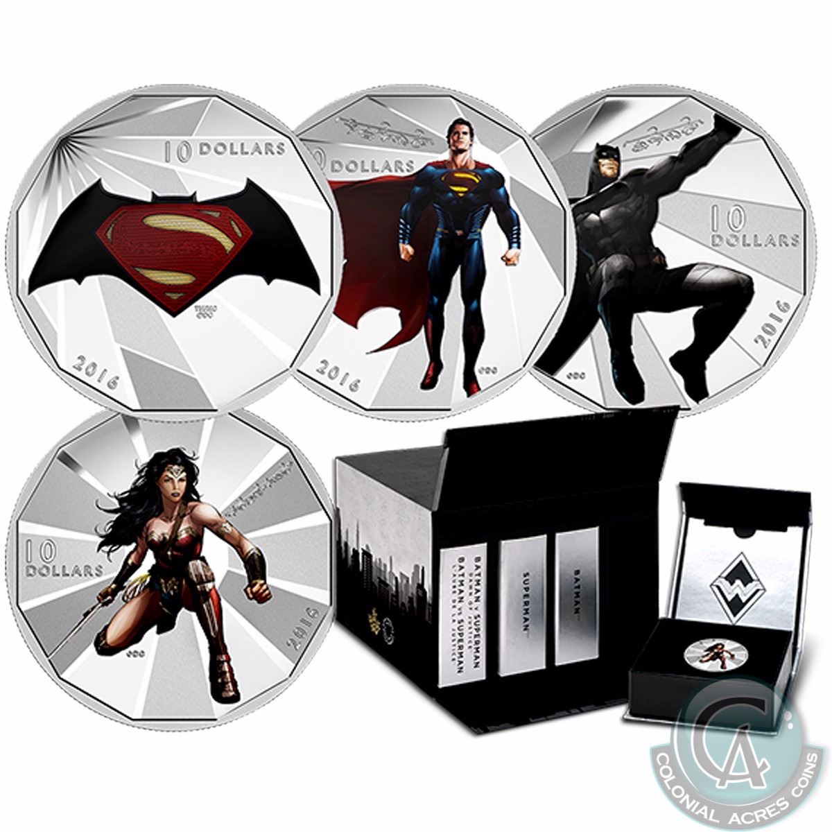 RCM Issue: 2016 Canada $10 Batman VS Superman Dawn of Justice 4-coin Fine Silver set. This set comes with all four $10 coins issued for this series: the 2016 $10 Logo, 2016 $10 Batman, 2016 $10 Superman, and the 2016 $10 Wonder Woman in a Vibrant Official RCM Display Case. 4pcs (Tax Exempt)