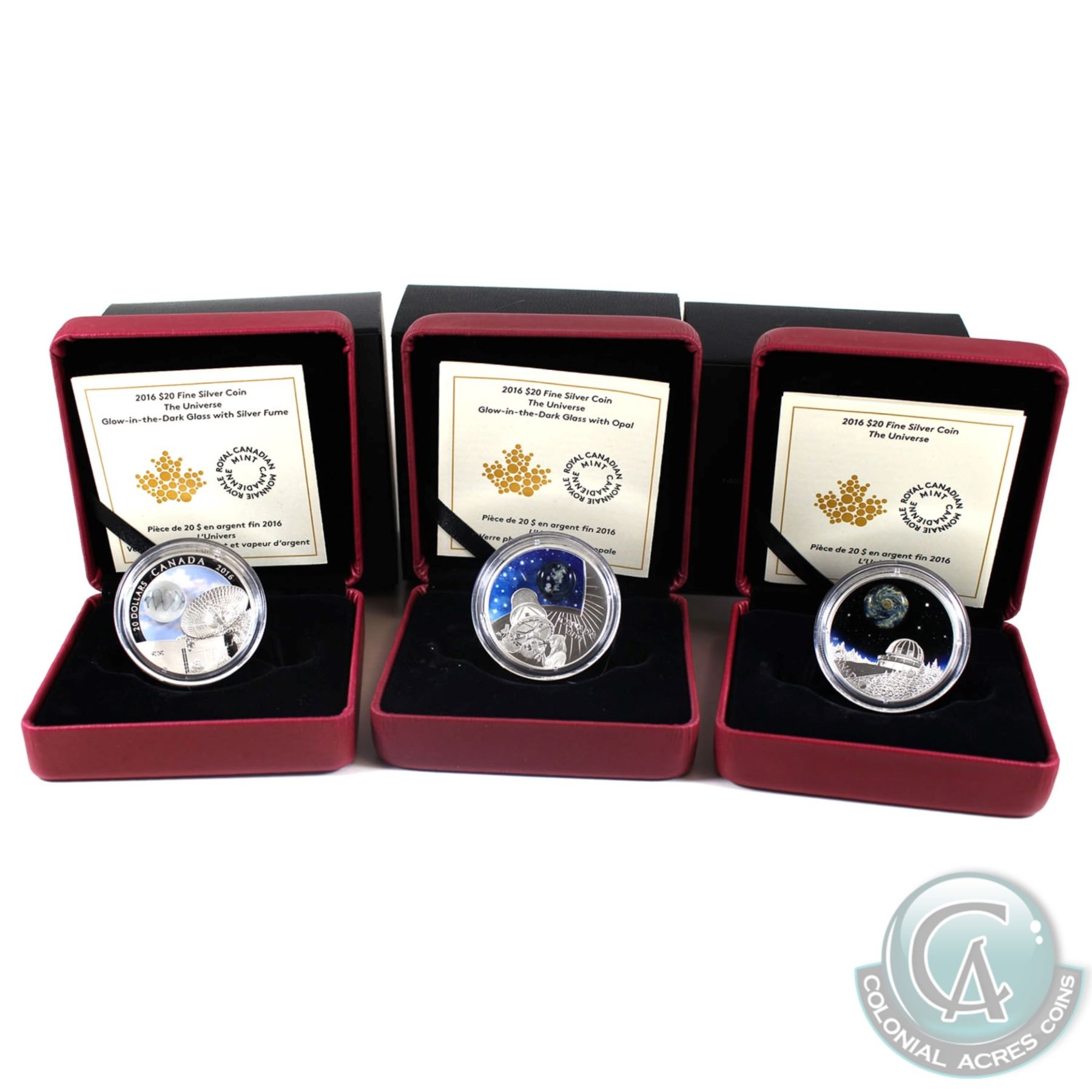 RCM Issue: 2016 Canada $20 The Universe, 2016 $20 The Universe - Glow-in-the-Dark Glass with Silver Fume & 2016 $20 The Universe - Glow-in-the-Dark Glass with Opal. 3pcs (TAX Exempt)