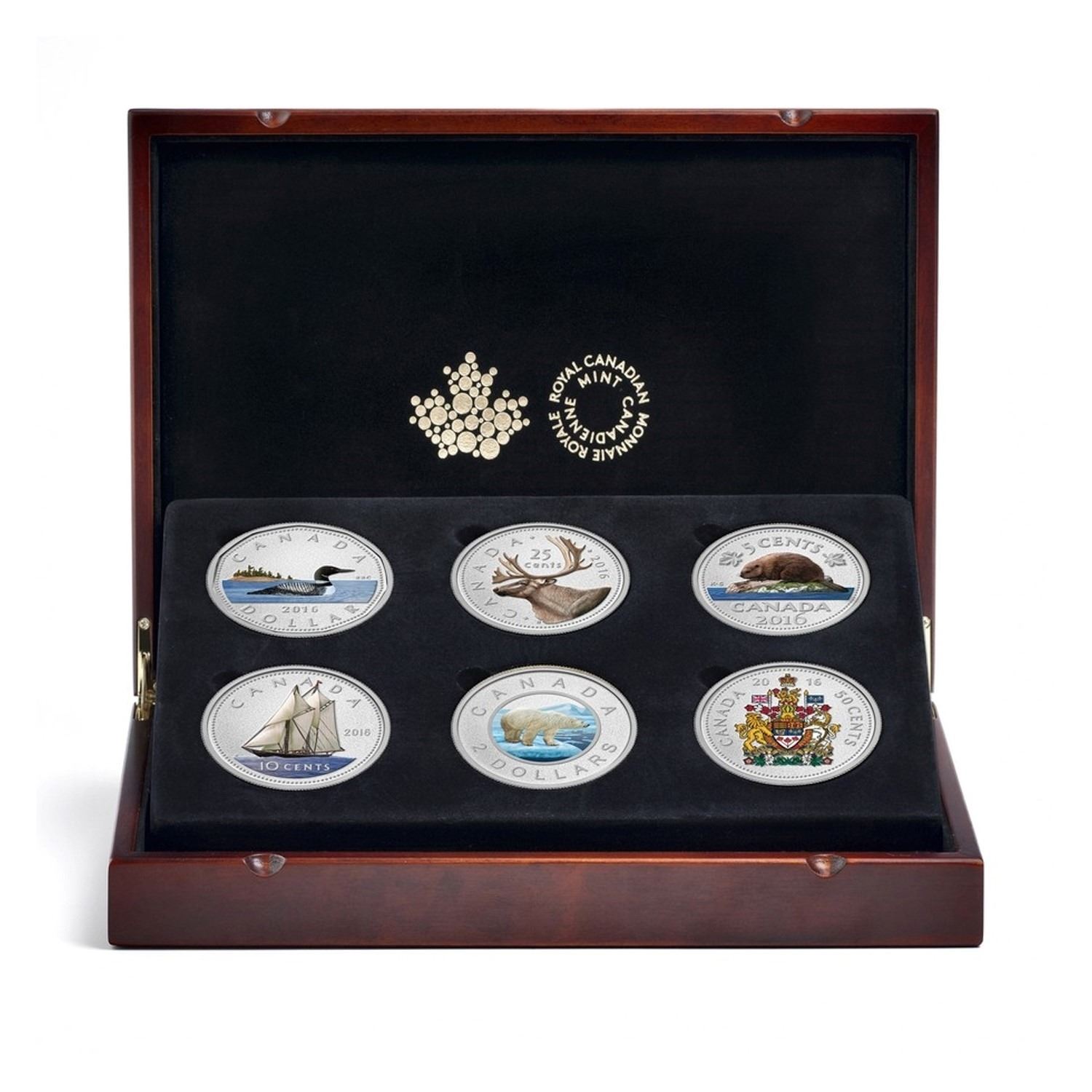 RCM Issue: 2016 Canada Big Coin 5oz. Coloured 6-coin Fine Silver 6-coin Set with Deluxe Subscription Case (capsules are lightly scratched or scuffed) Tax Exempt.
