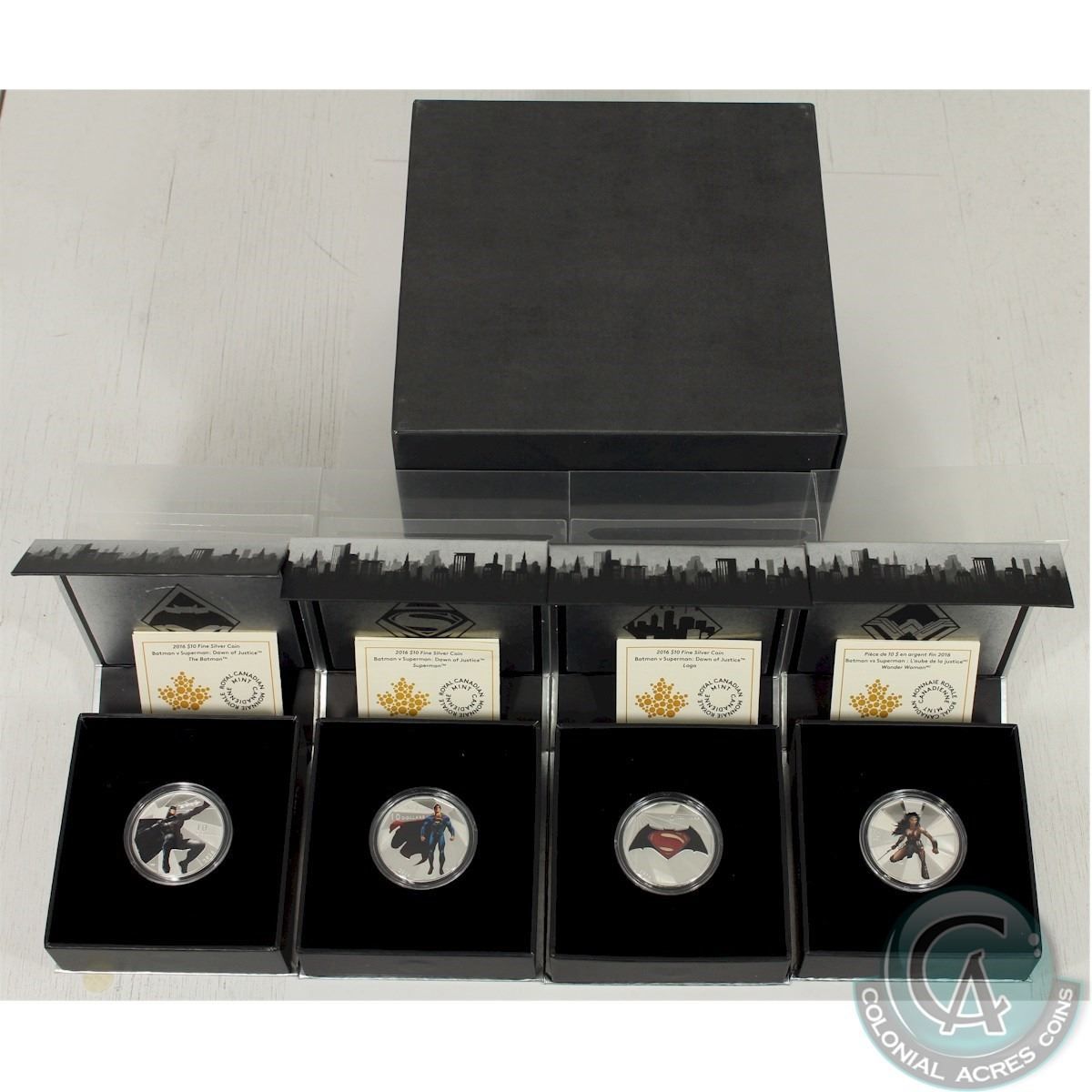 RCM Issue; 2016 Complete $10 Batman VS Superman Dawn of Justice Fine Silver Collection (Tax Exempt). You will receive Wonder Woman, Logo, Batman, and Superman. Coins come housed in the deluxe mint released series Box. 4pcs