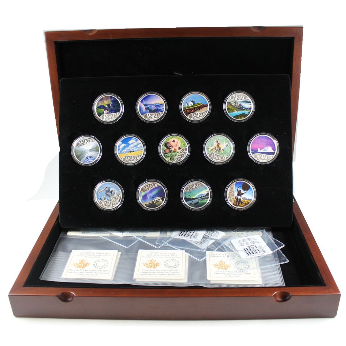 RCM Issue: 2017 Canada $10 Celebrating Canada's 150th Anniversary Complete Fine Silver Coloured 13-coin Set in Deluxe Display Case (Tax Exempt). Please note there is a chip on one corner.