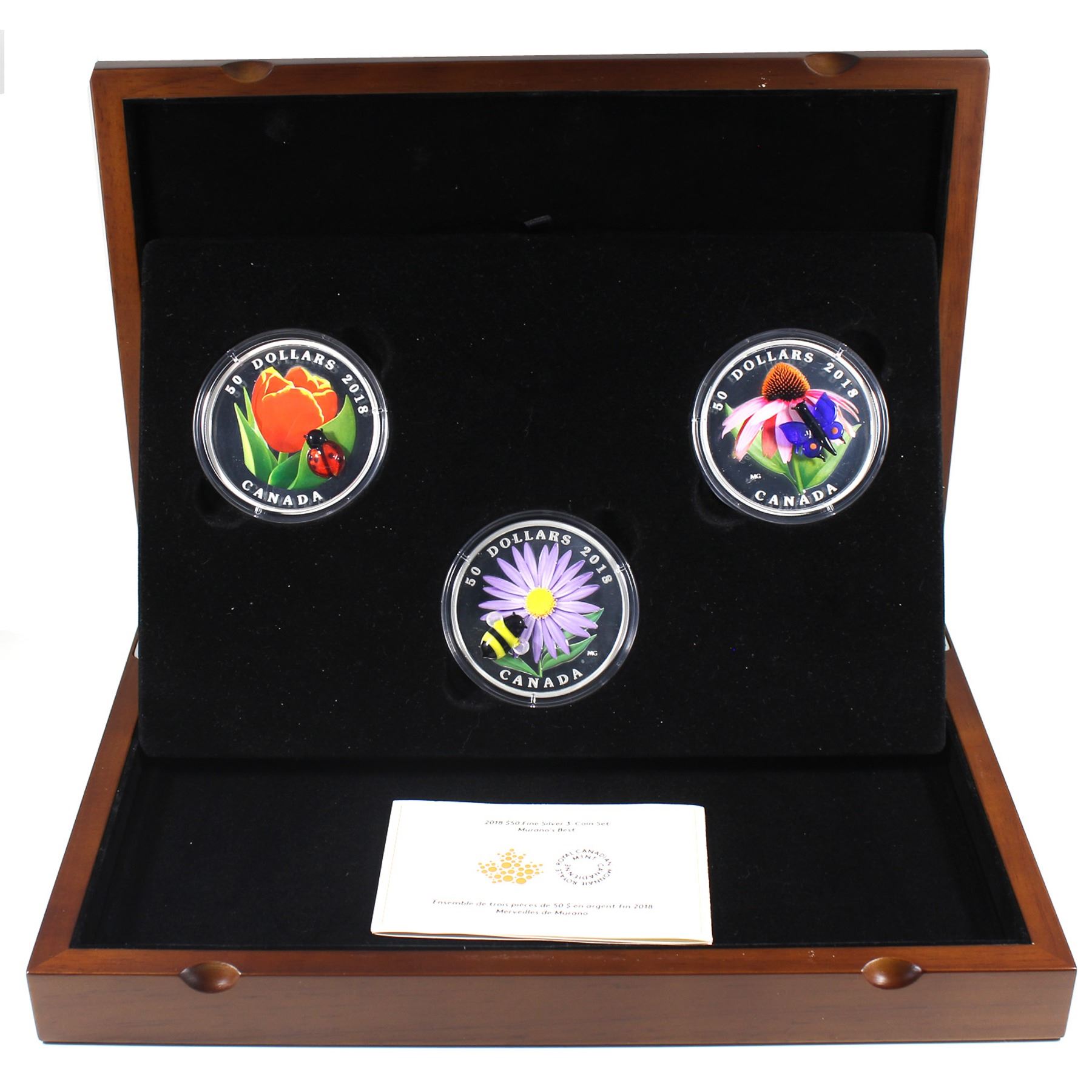 RCM Issue: 2018 $50 Murano's Best Fine Silver 3-Coin Set (TAX Exempt). This limited mintage set includes the Tulip with Ladybug, Aster with Bumble bee, and Purple Coneflower with Eastern Tailed Blue Butterfly. Please note capsules may contain faint scratches, and coins contain some minor spots. Comes in a RCM Issue Maplewood display case with COA, 325/850.
