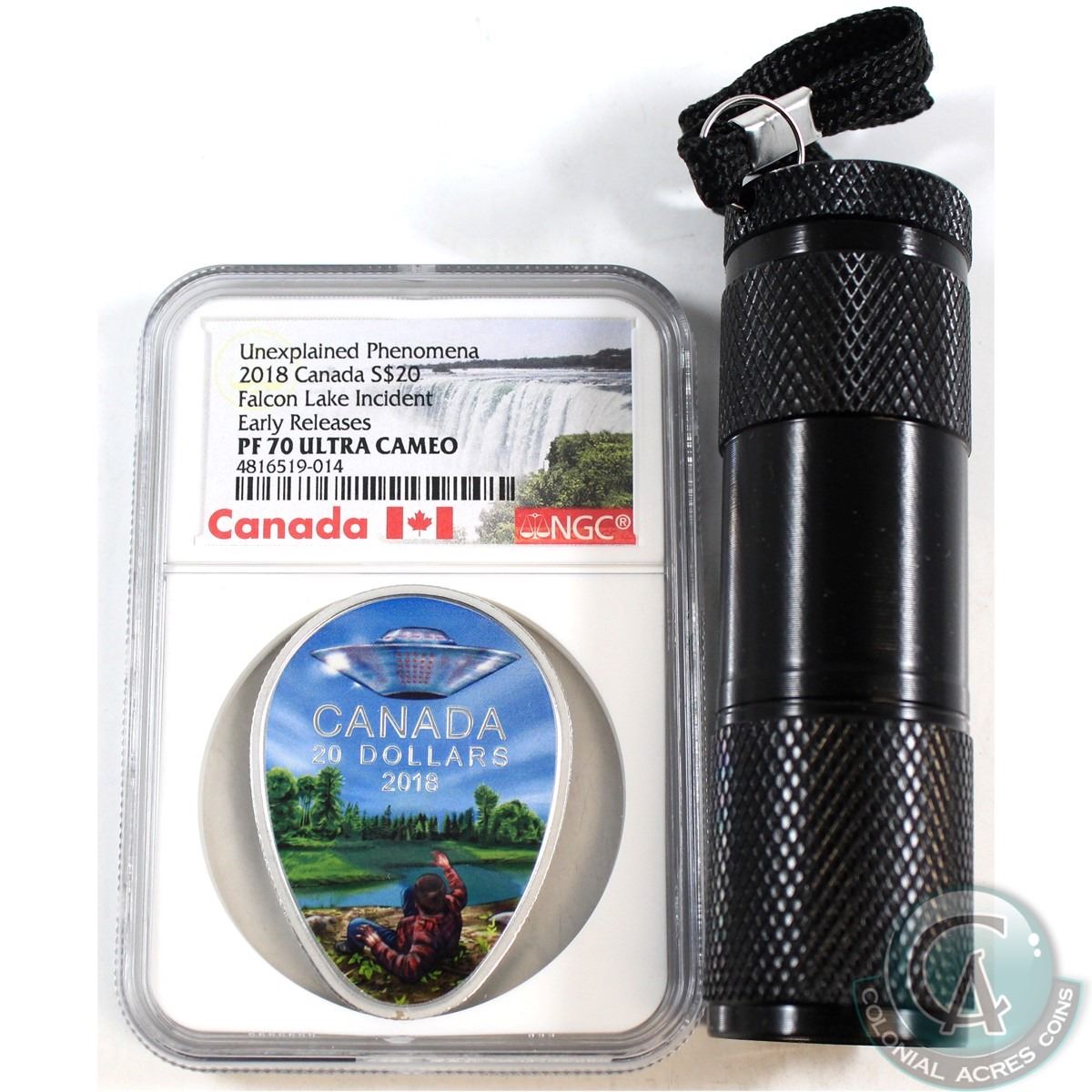 RCM Issue; 2018 Canada $20 Falcon Lake Incident NGC Certified PF-70 Early Releases (Tax Exempt). Comes with Black Light.