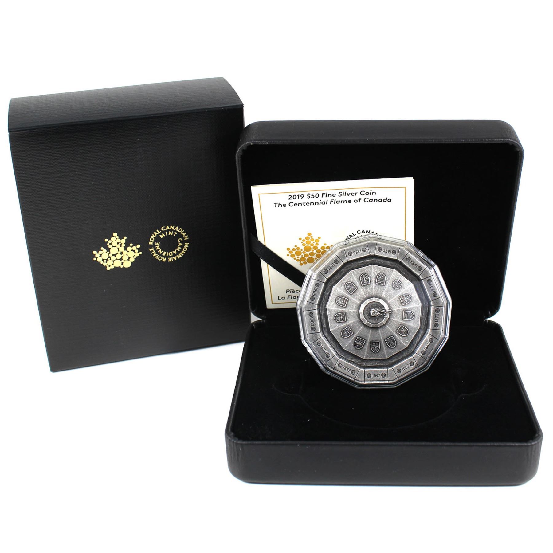 RCM Issue: 2019 $50 The Centennial Flame of Canada Fine Silver Coin (TAX Exempt). This is the first tridecagon issued coin to replicate a famous Canadian landmark in incuse relief. Limited Mintage!
