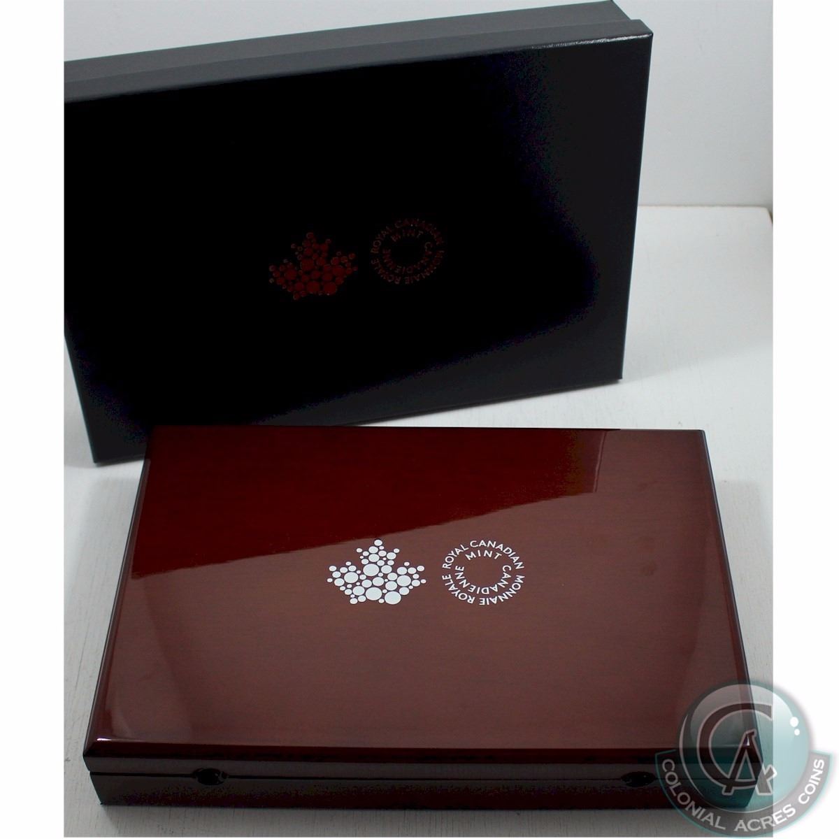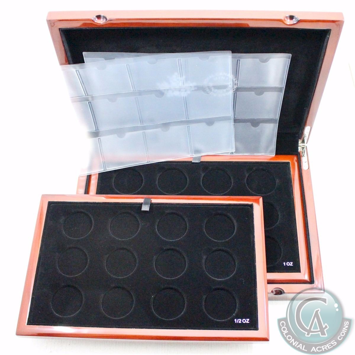 RCM Issue: Beautiful Deluxe Royal Canadian Mint Wooden Display Box with Black Felt Lining Including Two Removable Trays. One tray is for 1oz and the other is for 1/2oz coins and both have 12 slots.