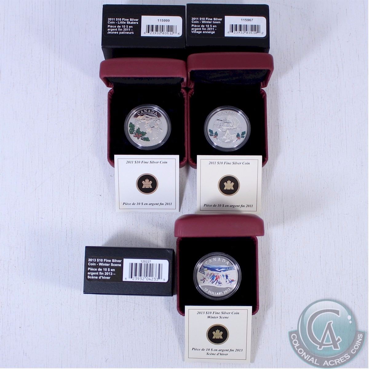 RCM Issue: Lot of 3x Canada $10 Fine Silver Coins: 2011 Little Skaters, 2011 Winter Town & 2013 Winter Scene (Tax Exempt). 3pcs