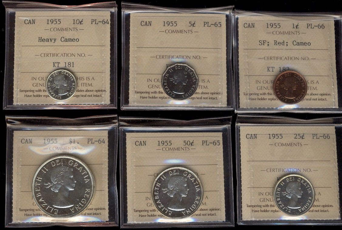 RCM Lot. 1955 Proof Like Set. Includes mix of PL64 to PL66 coinage all ICCS graded some with Cameo to Hvy Cameo designations.