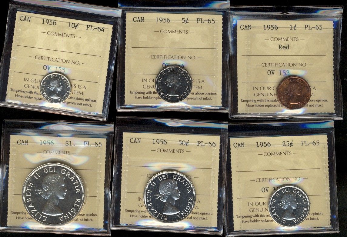 RCM Lot. 1956 Proof Like Set. Includes mix of PL64 to PL66 coinage all ICCS graded some with Cameo designations.