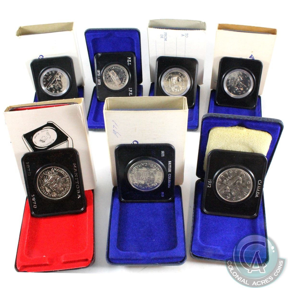 RCM Lot: 1970-1976 Canada Proof-Like Cased Nickel Dollars. The dates you will receive are: 1970, 1971, 1972, 1973, 1974, 1975, and 1976. Coins come in a clamshell display case. (7pcs)