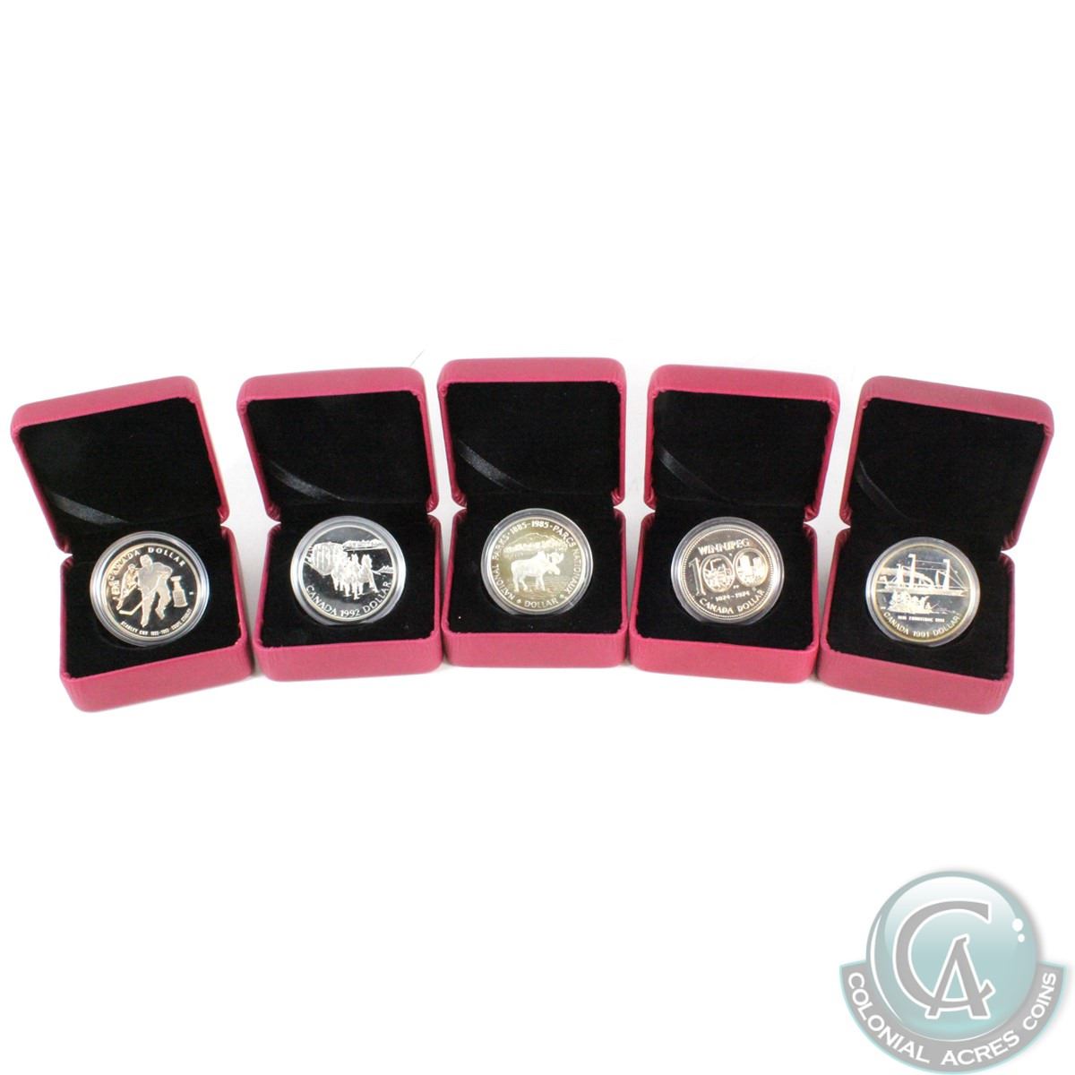 RCM Lot: 1974-1993 Canadian Commemorative Silver Dollars. The dates included in this lot are: 1974, 1985, 1991, 1992, and 1993. Coins come encapsulated in a red clamsell case (coins contain natural toning). (5pcs)