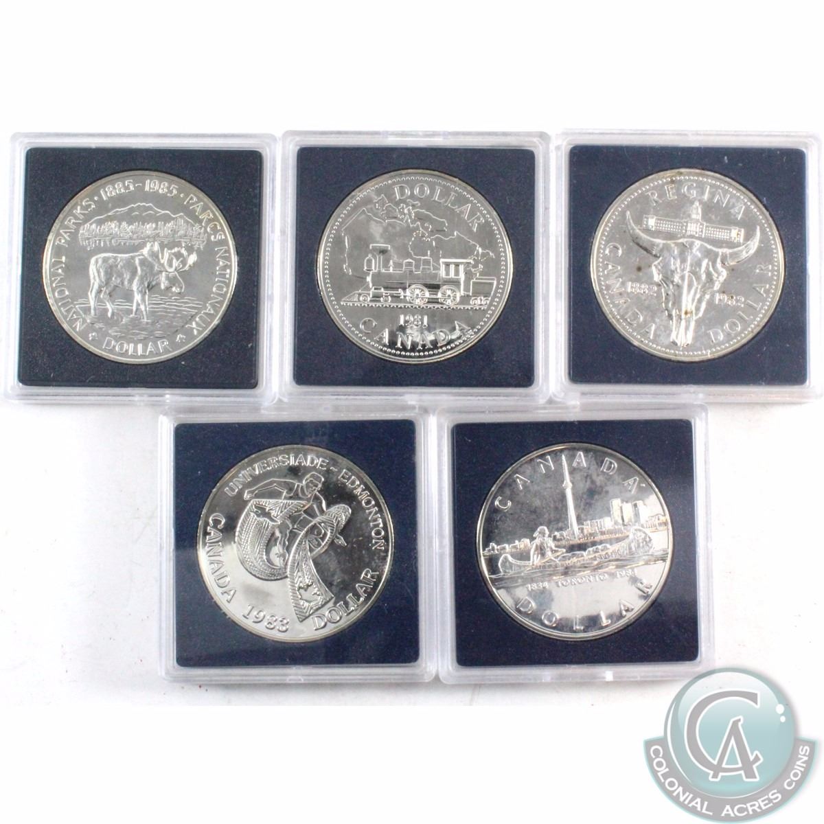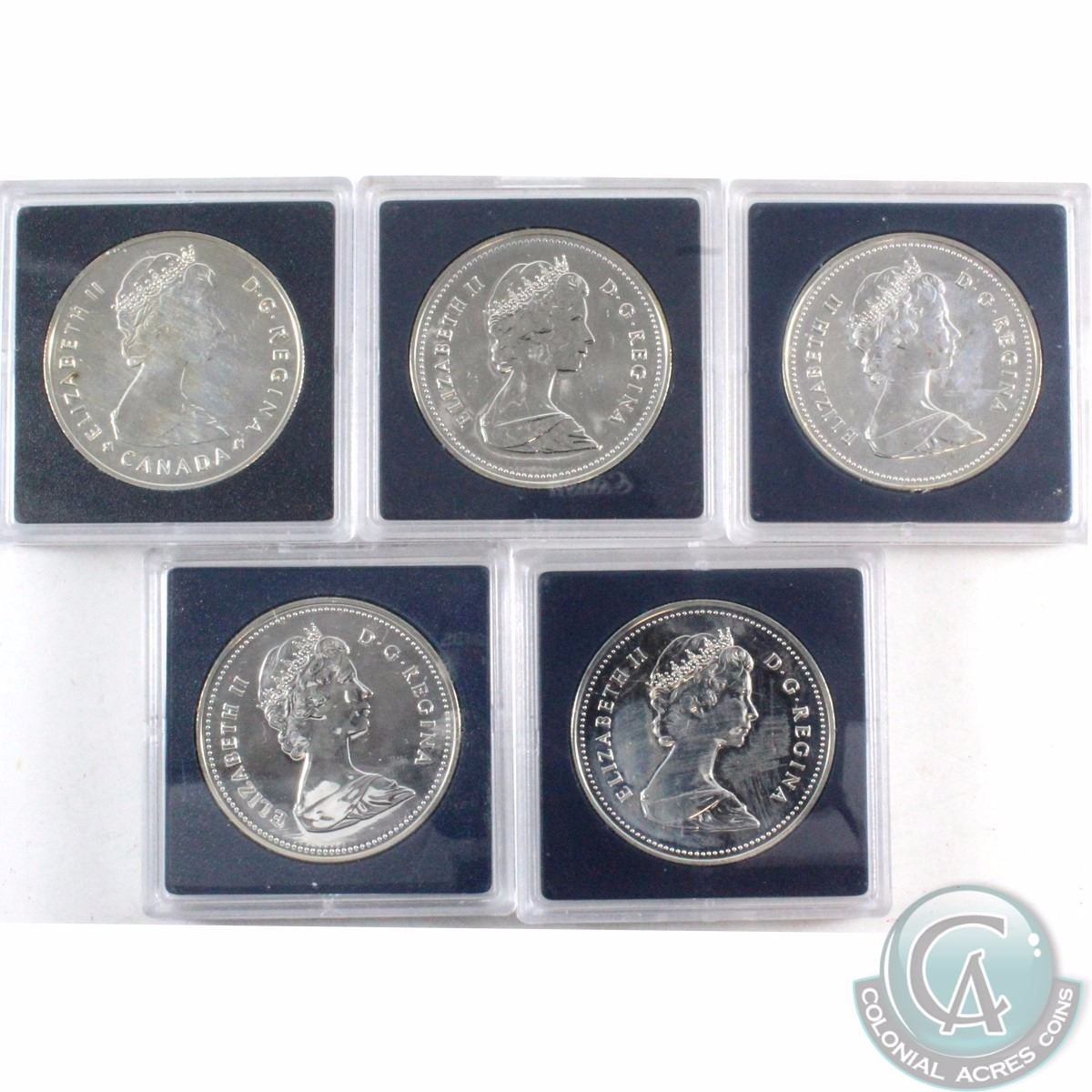 RCM Lot: 1981-1985 Canadian Brilliant Uncirculated Cased Silver Dollars. The dates included in this lot are: 1981, 1982, 1983, 1984 and 1985. Coins come encapsulated in a square capsule (coins are naturally toned, capsules scratched) (5pcs)